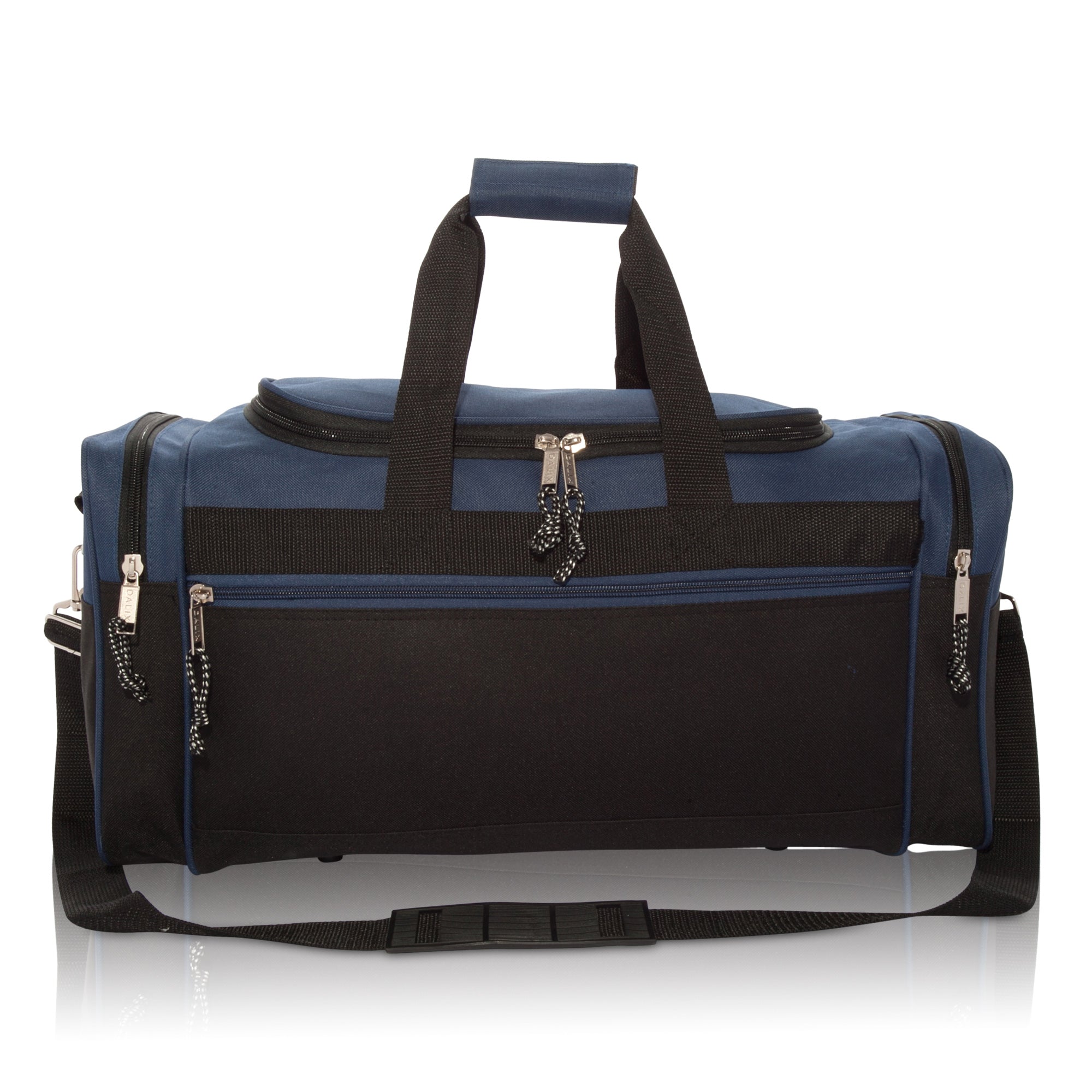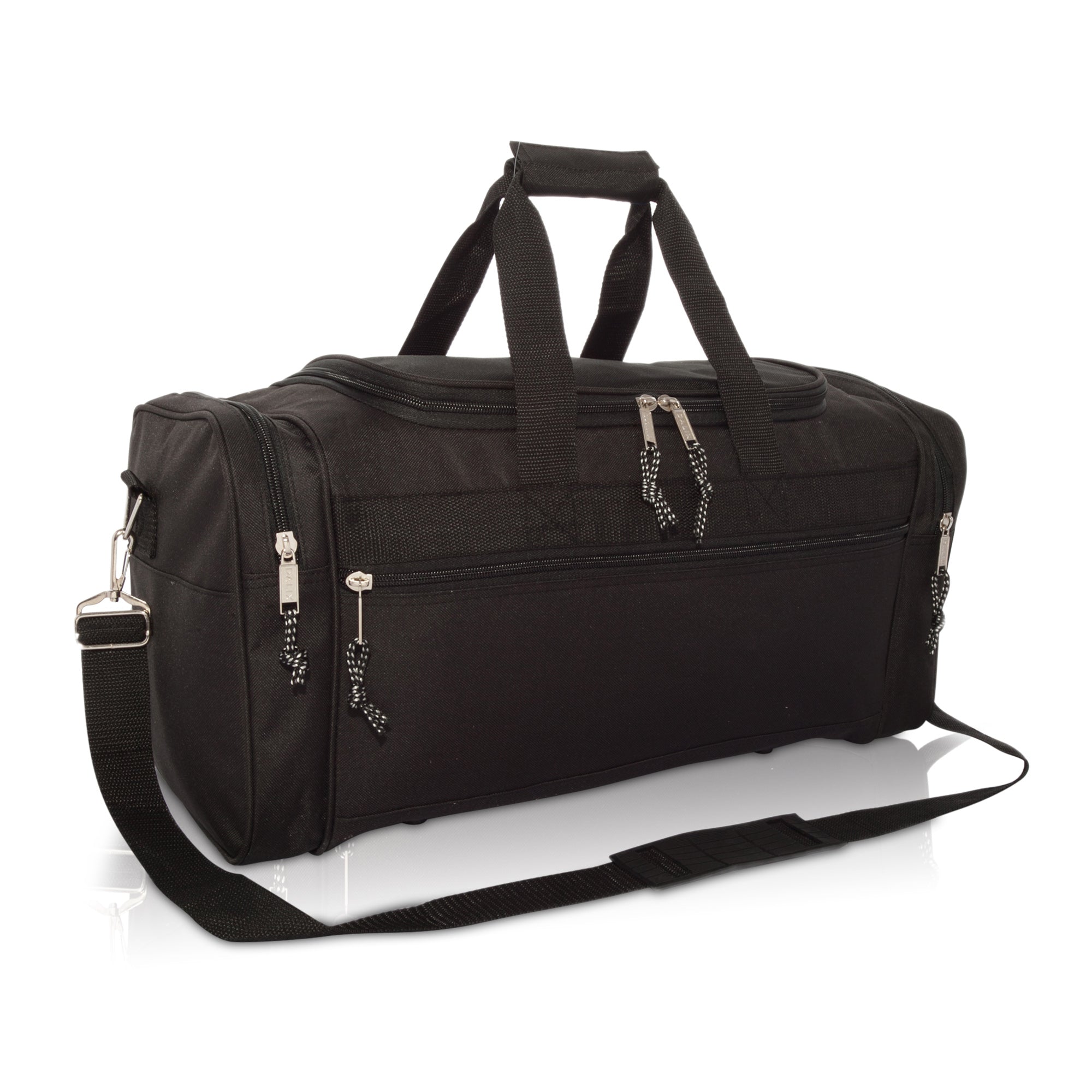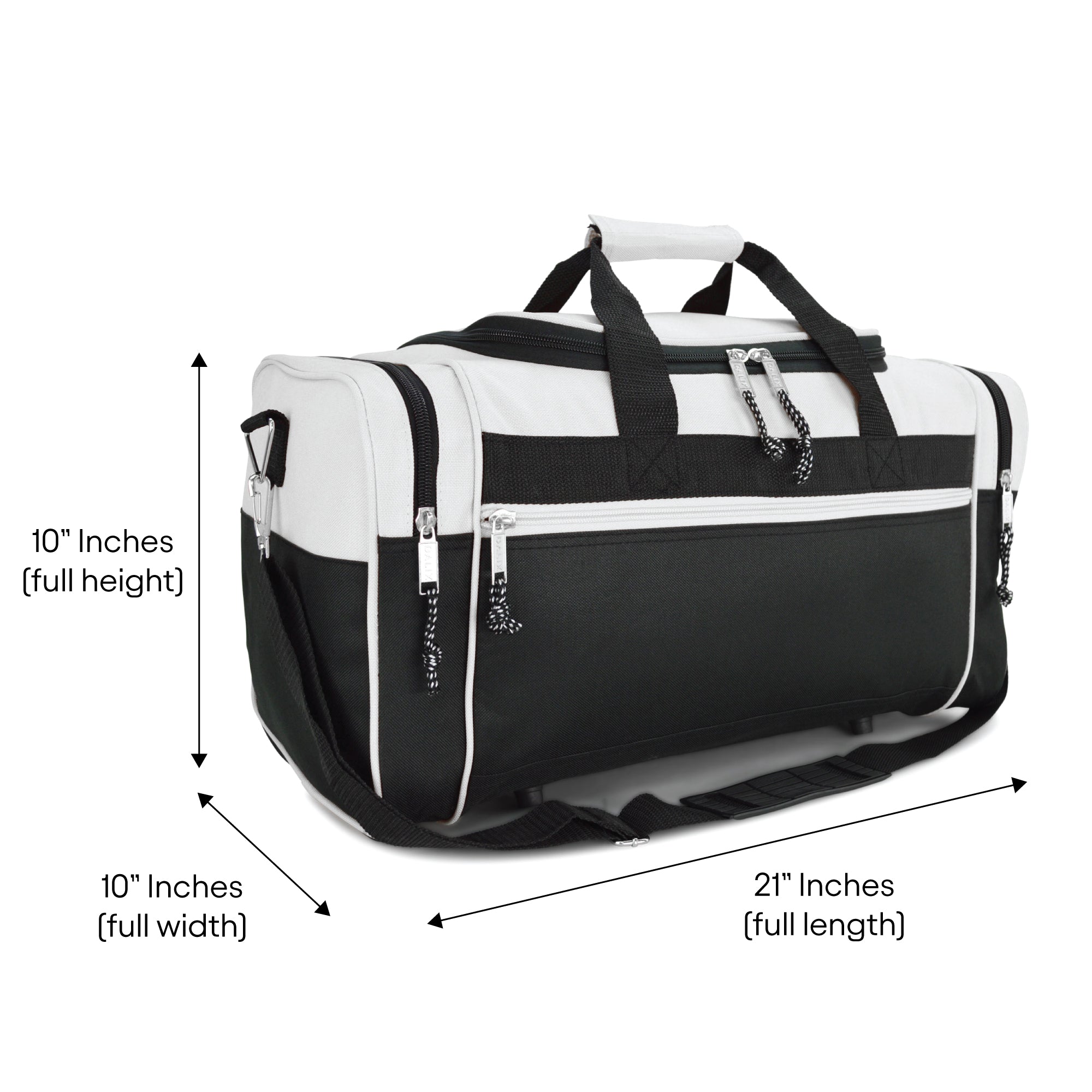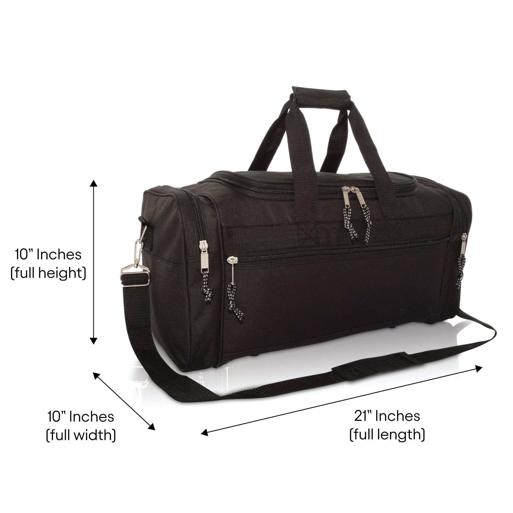 DALIX consistently reaches the pinnacle of affordable and useful everyday items. This is our 21" Duffel bag which has a top-entry Dual Zippered compartment for storage, along with that includes dual side zippered compartments for extra storage use of accessories, keys, water bottles, etc. Located on the front is another Zippered compartment for storage of smaller accessories or documents to take with you. Included is straps with shoulder pads.