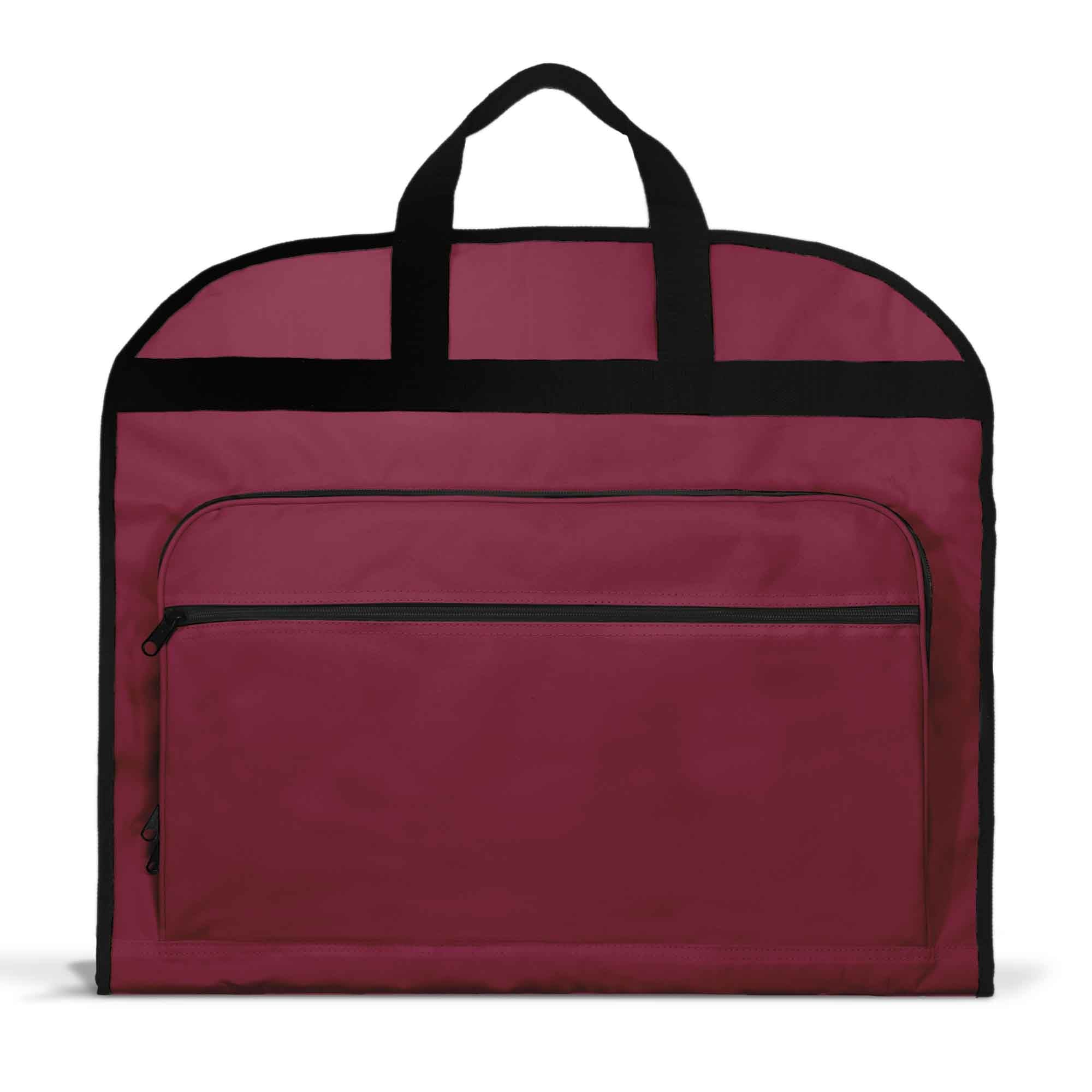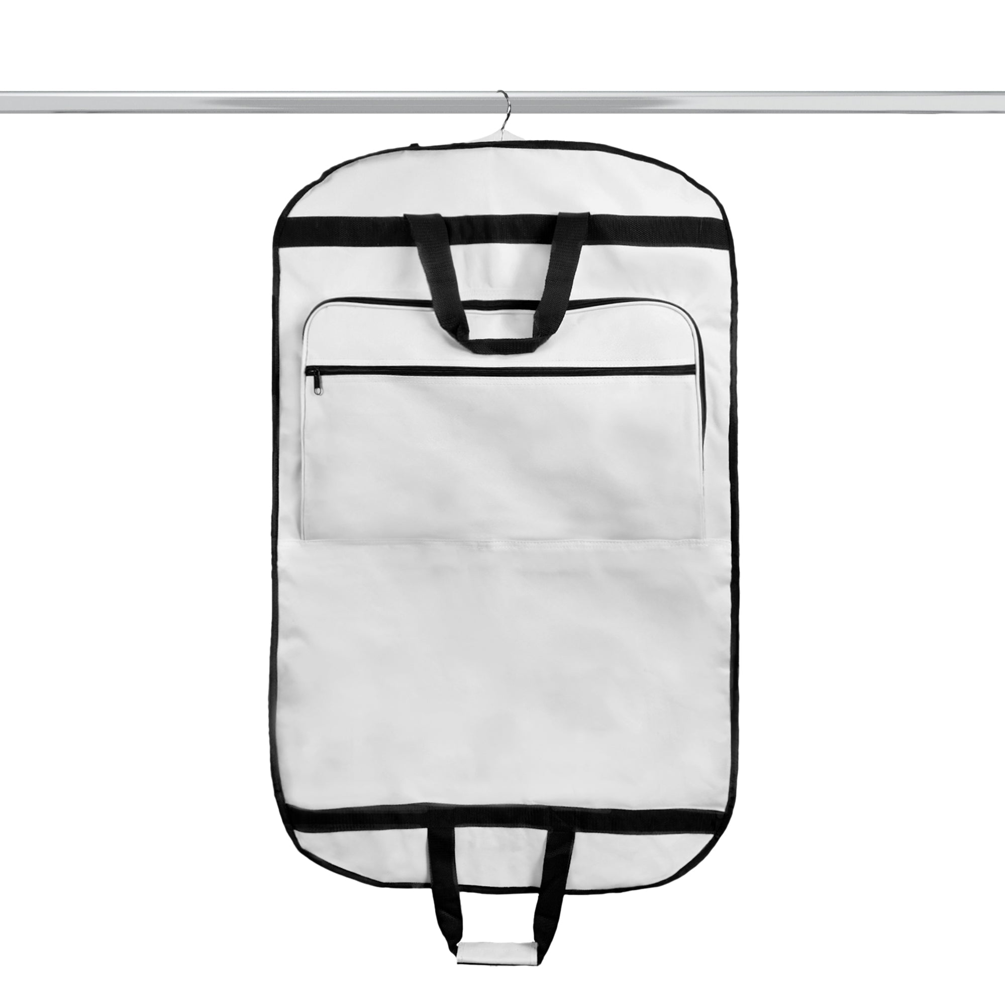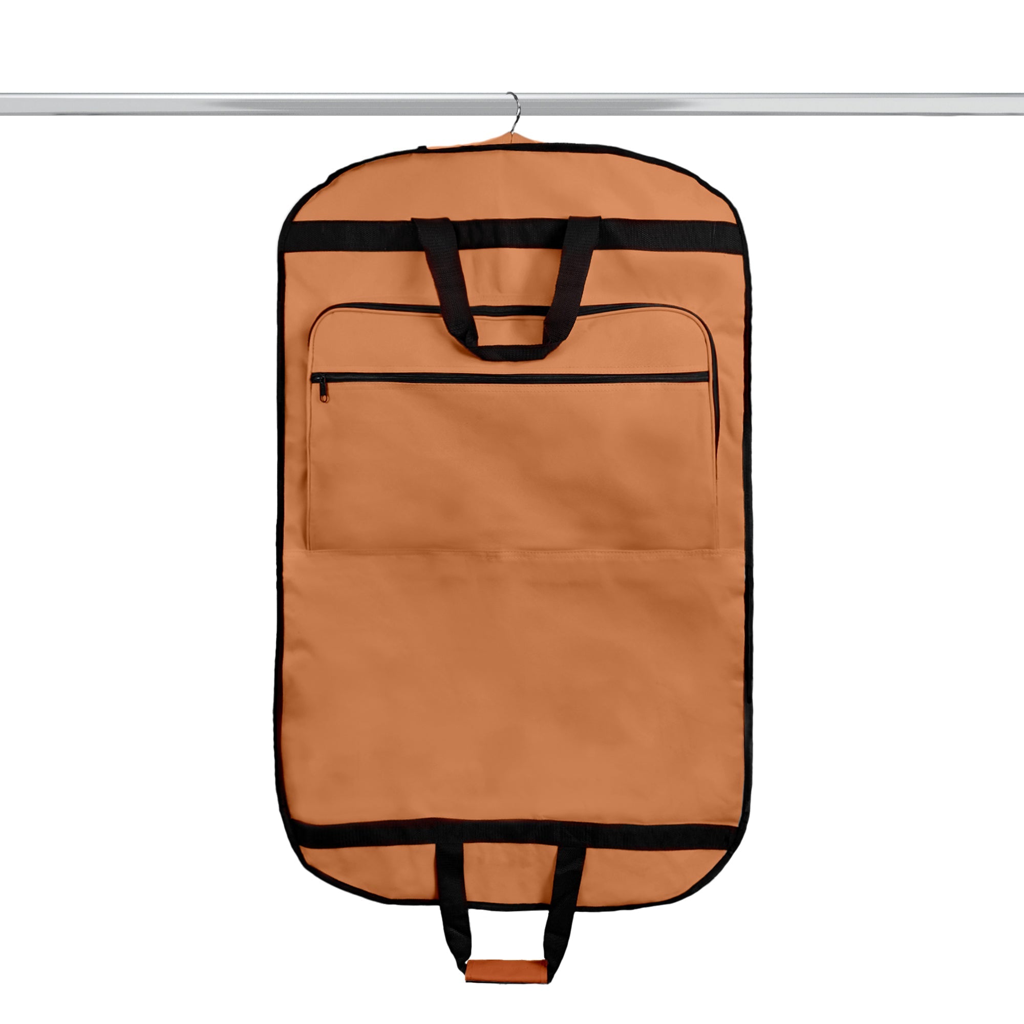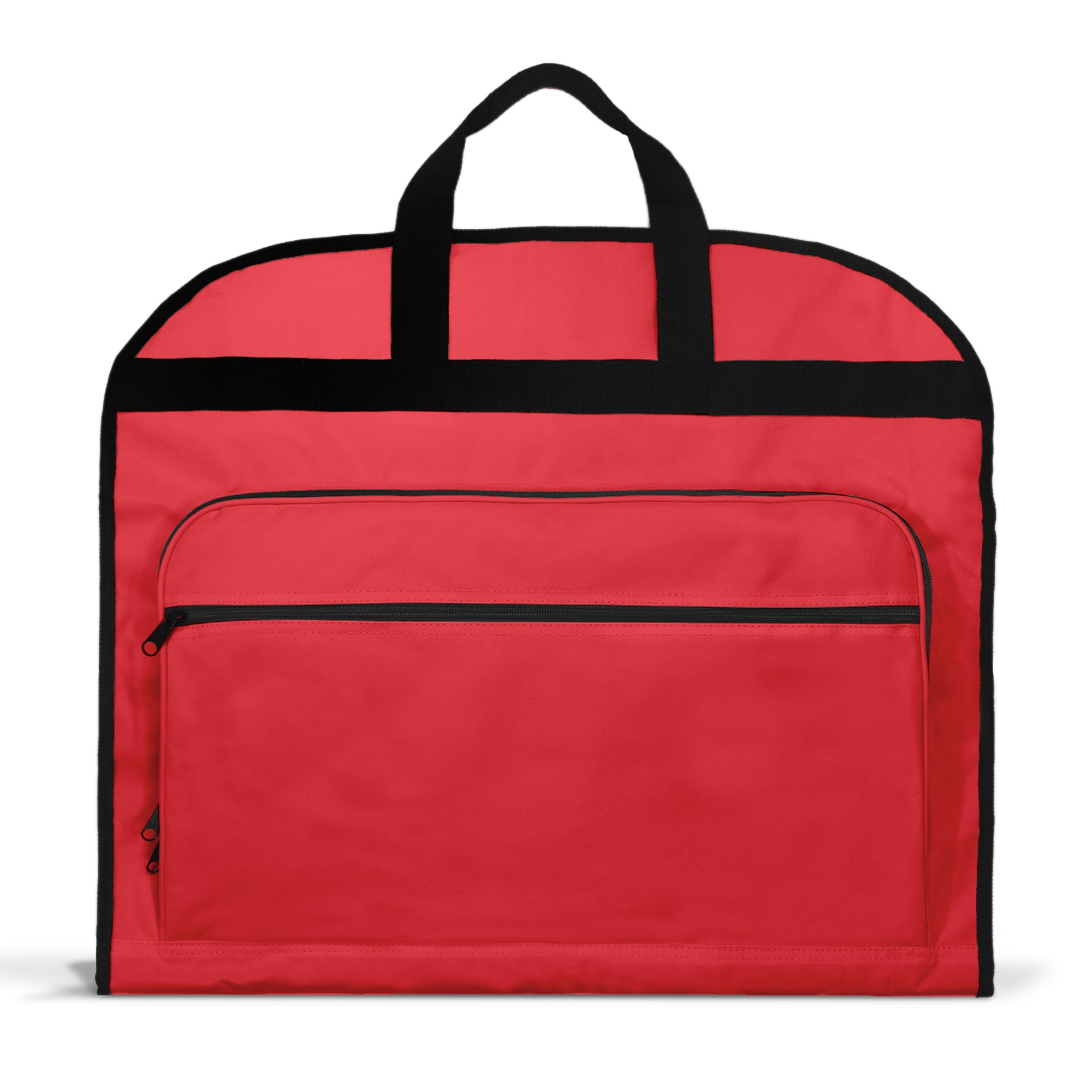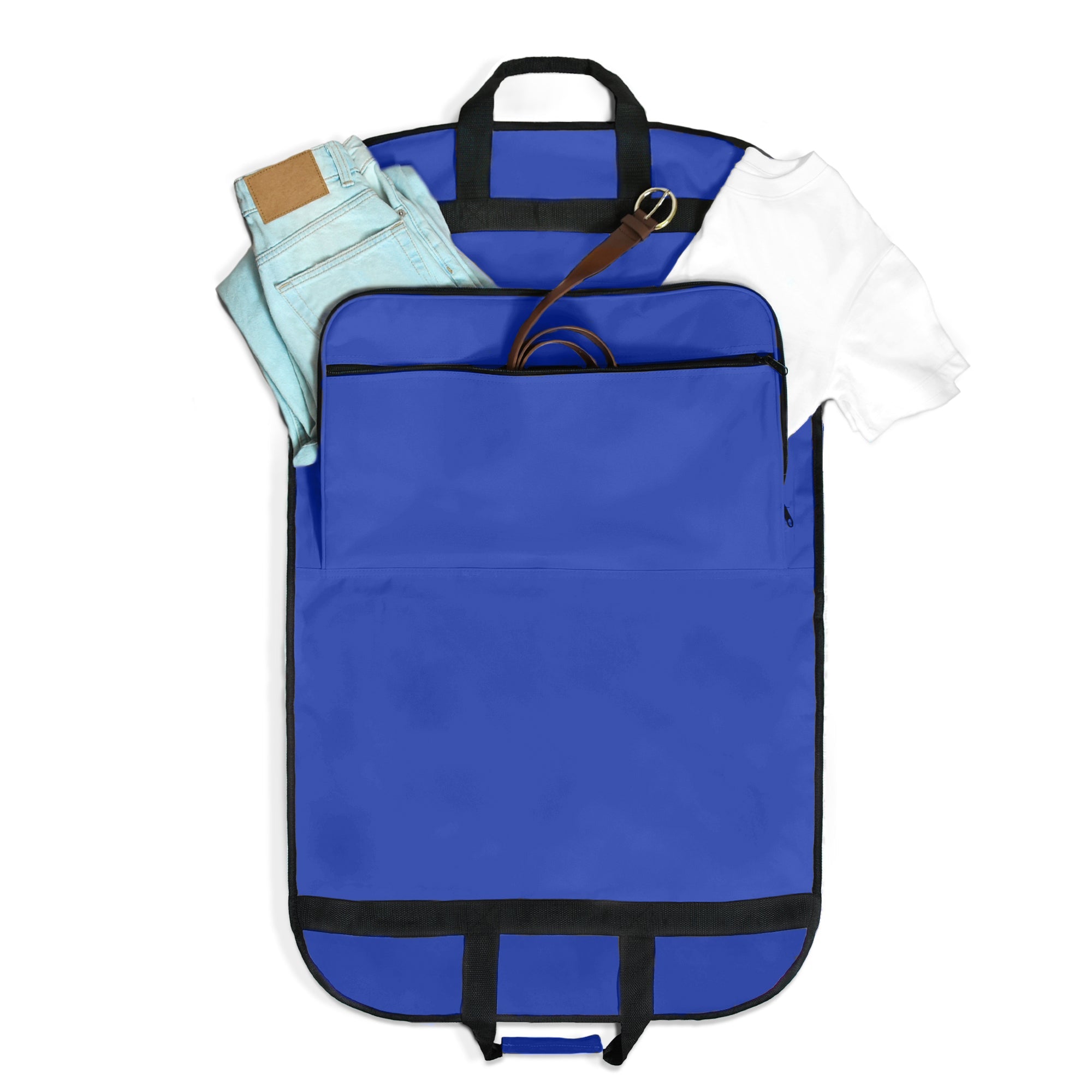 This will complement your travel needs with ease and affordability. The fold able garment bag features a main compartment opened down the middle with a zipper: fits about 1-2 suits or 8 + shirts. On the top-side includes an opening for hangers to set in closets or hang in the car. Card Holder on Top of the bag for Name tag or Identification Card. In the front of the bag includes an extra storage compartment (dual-zippered) and a front end smaller zipper pocket for small accessories and shoes.