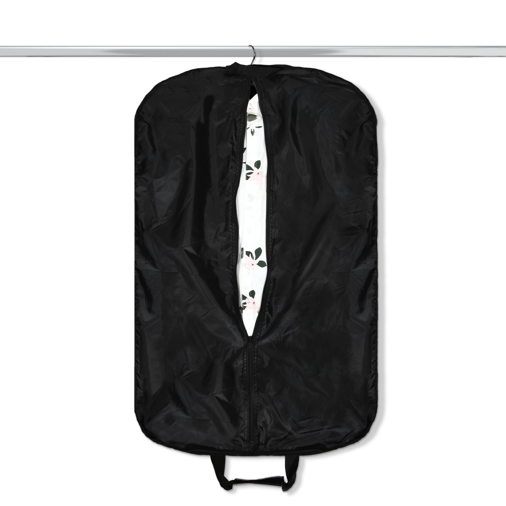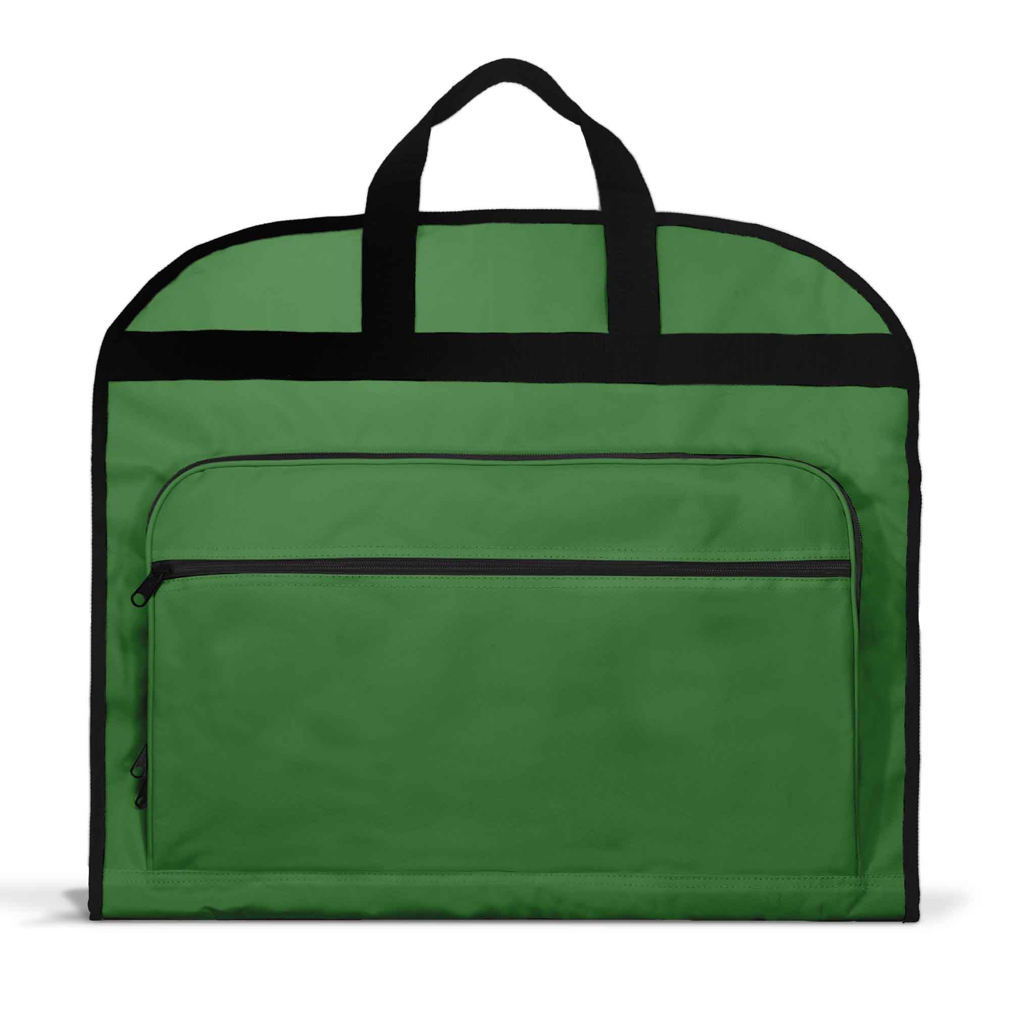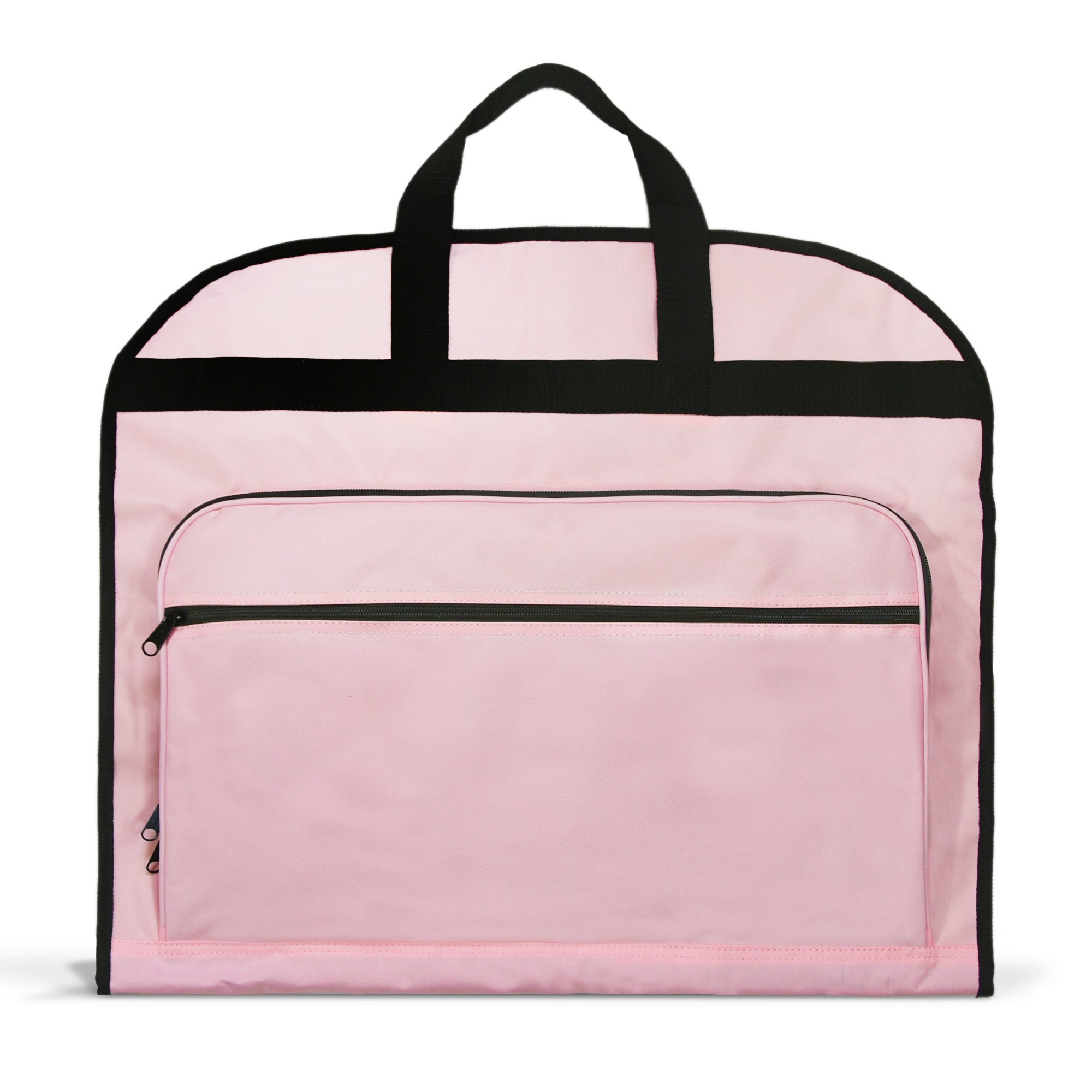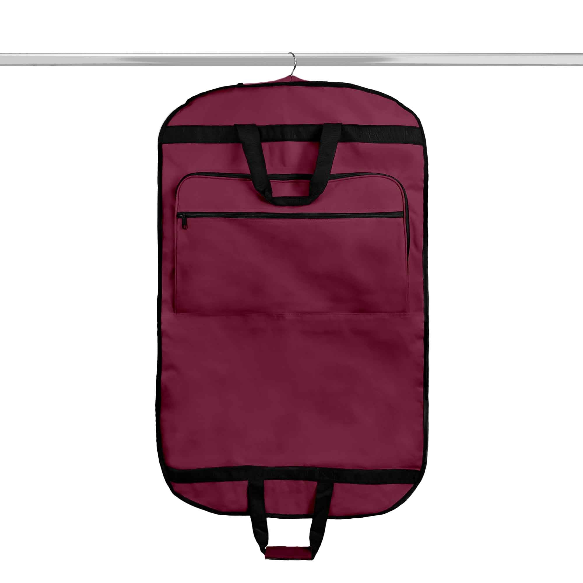 This will complement your travel needs with ease and affordability. The fold able garment bag features a main compartment opened down the middle with a zipper: fits about 1-2 suits or 8 + shirts. On the top-side includes an opening for hangers to set in closets or hang in the car. Card Holder on Top of the bag for Name tag or Identification Card. In the front of the bag includes an extra storage compartment (dual-zippered) and a front end smaller zipper pocket for small accessories and shoes.