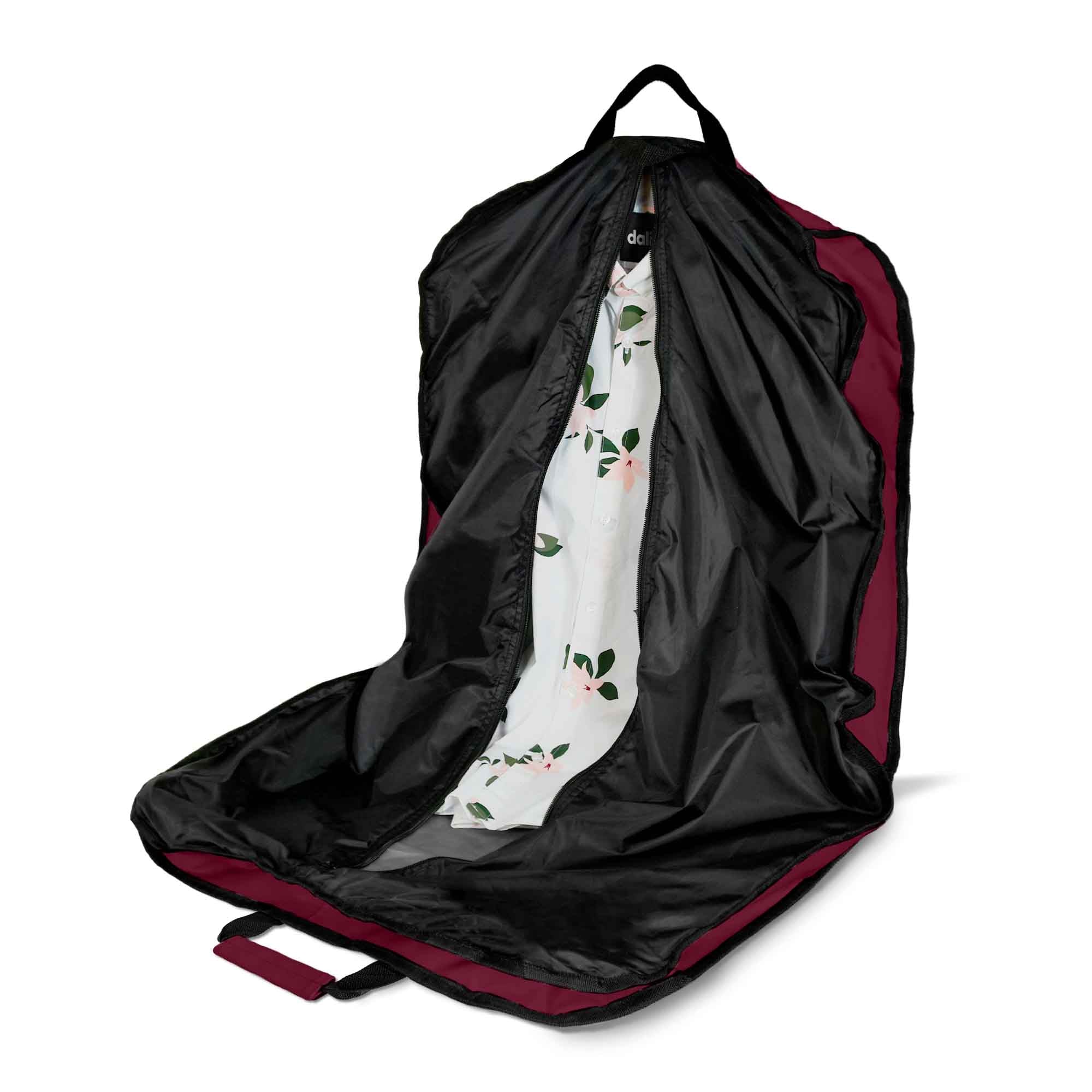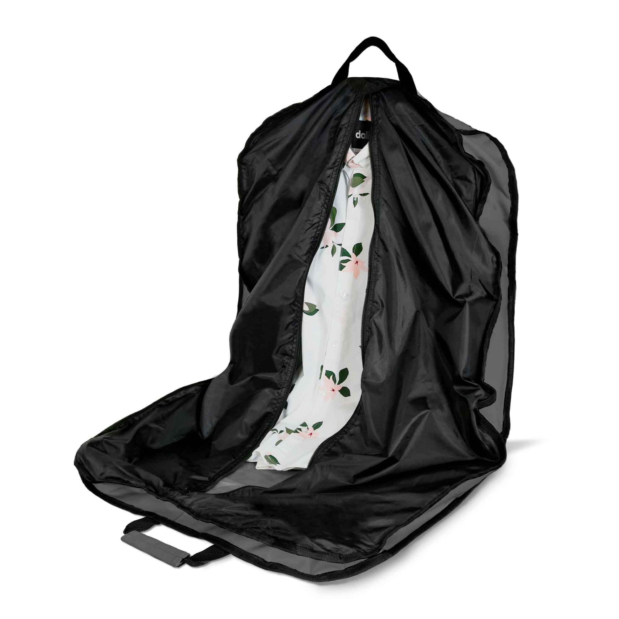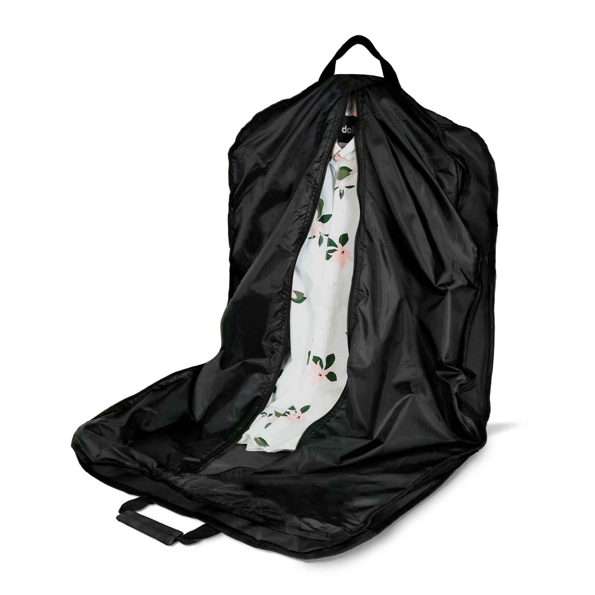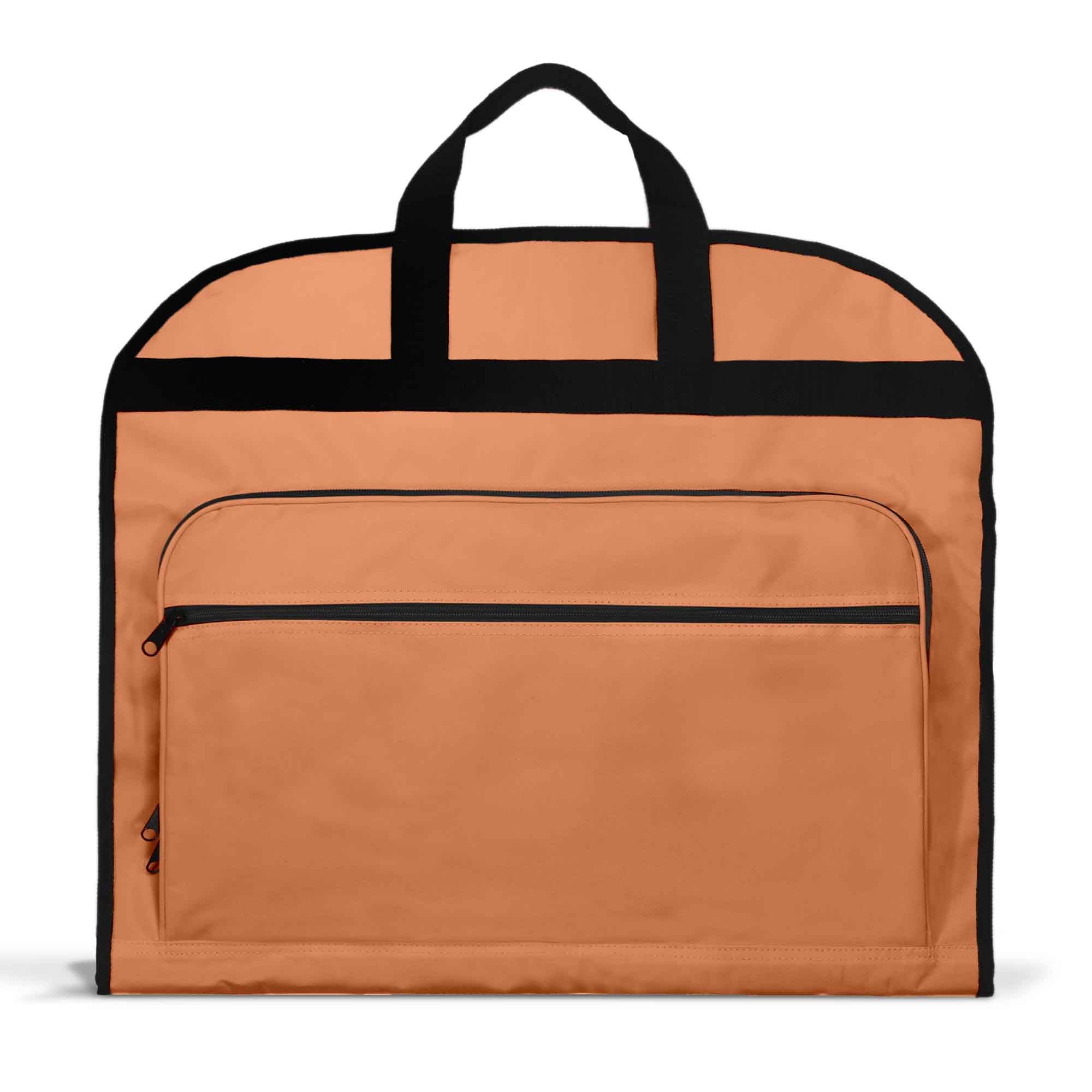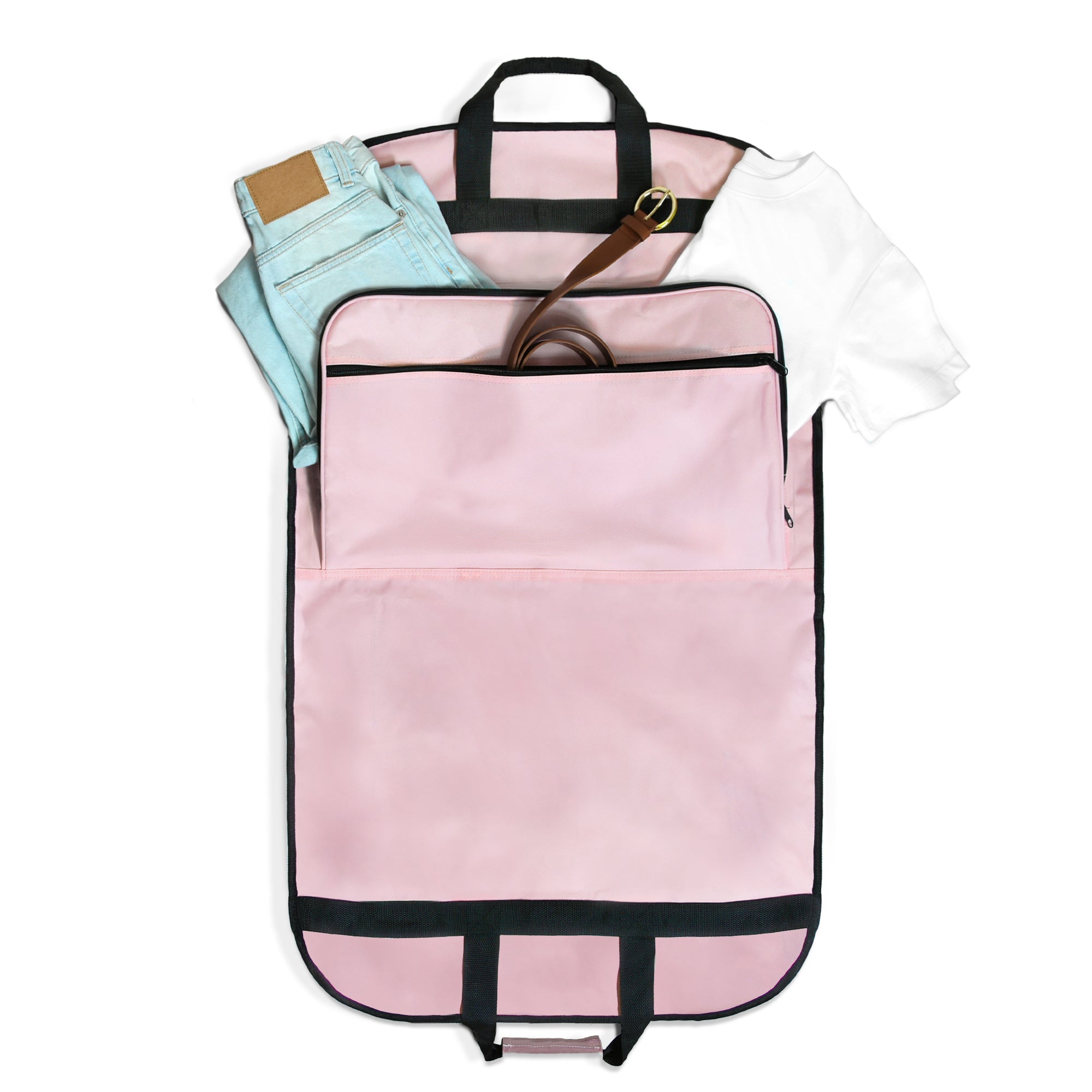 This will complement your travel needs with ease and affordability. The fold able garment bag features a main compartment opened down the middle with a zipper: fits about 1-2 suits or 8 + shirts. On the top-side includes an opening for hangers to set in closets or hang in the car. Card Holder on Top of the bag for Name tag or Identification Card. In the front of the bag includes an extra storage compartment (dual-zippered) and a front end smaller zipper pocket for small accessories and shoes.