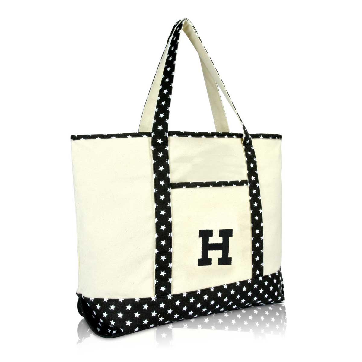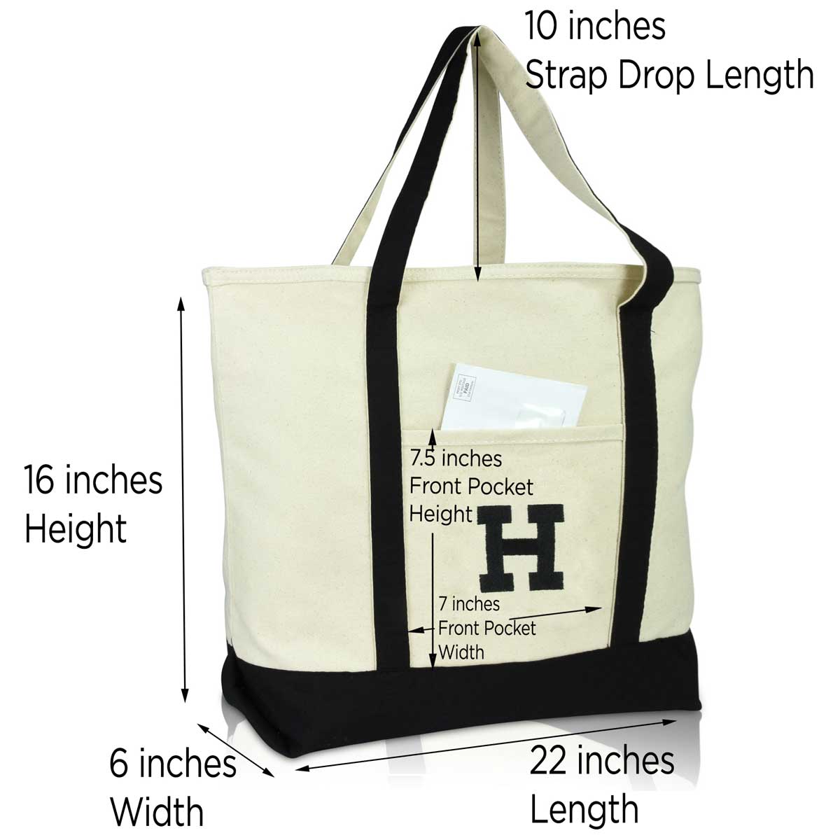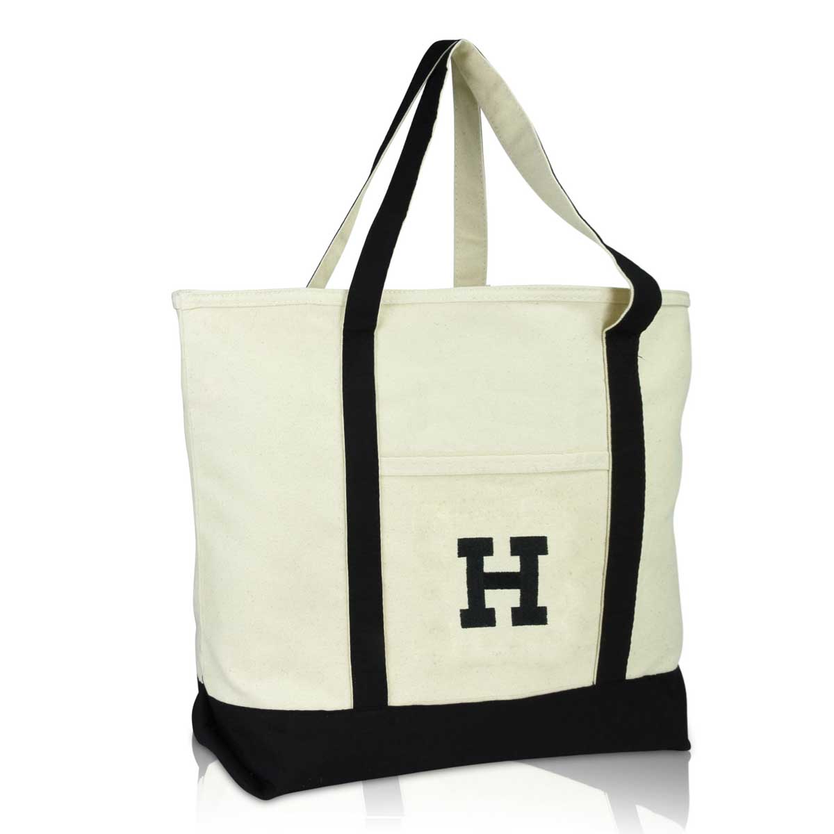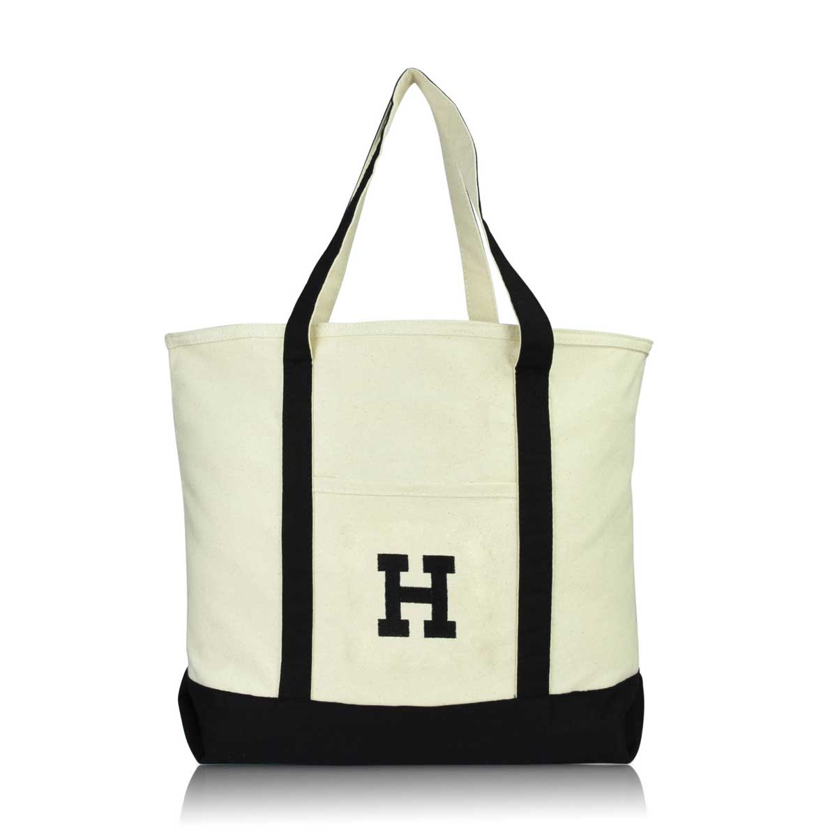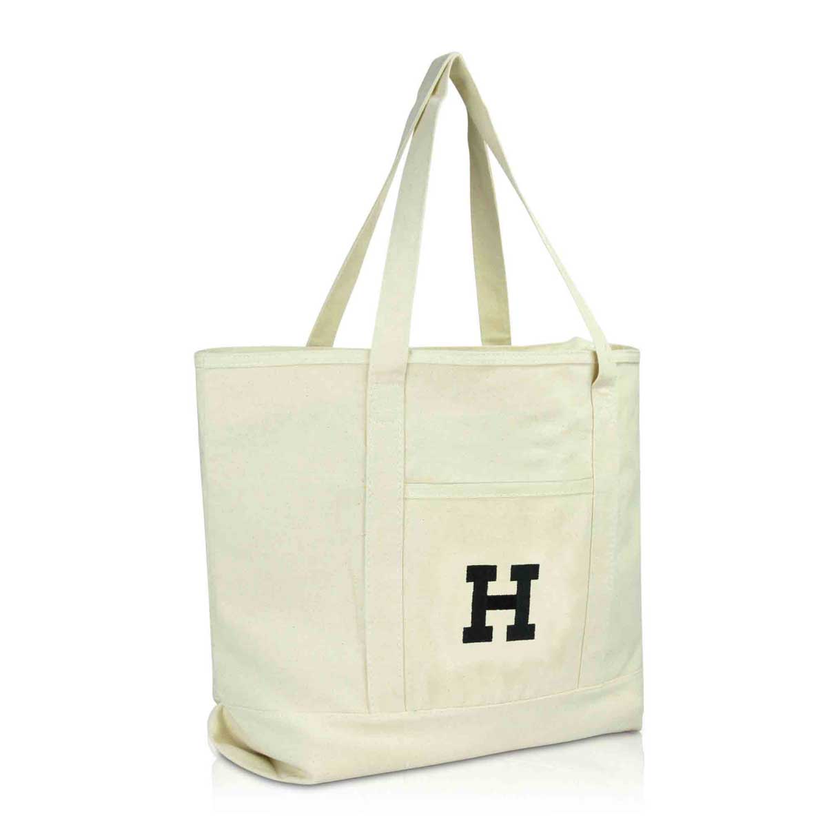 Our best selling DALIX tote for women of all ages, now features beautiful premium embroidery initial of your choice! Custom designed, our tote features a beautiful monogram letter "H" of your favorite name or word! Sewn with premium threading, each tote has a different color theme with a complementing letter color. We ensure an ever-lasting embroidery design on our tote bags. Suitable to carry on you for days out at the beach, grocery shopping at the market, or simply carrying it to work with you. And if you're a student or teacher, what better tote to carry into class with your textbooks and folders? It is also perfect as a personalized gift for weddings and holidays to your friends, family, or even if it is a special gift to yourself. This tote features a heavy duty 12 oz. cotton canvas material with a zipper closure for safety when you travel to ensure your accessories and belongings don't fall out. There is also a front pocket for accessories storage, and comes in more wonderful colors! For those on a budget but still wanting a quality product, this is a great gift under 20 dollars which will last for time to come.