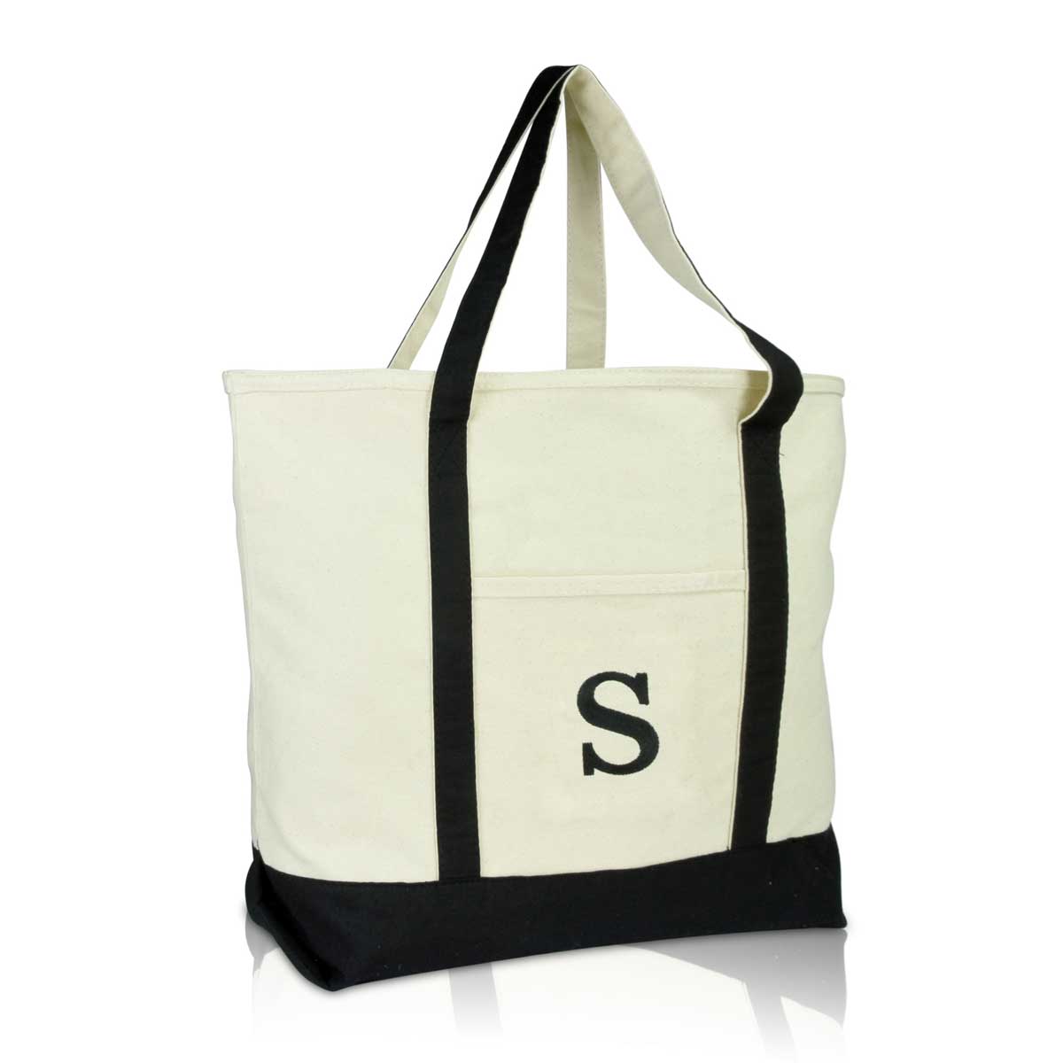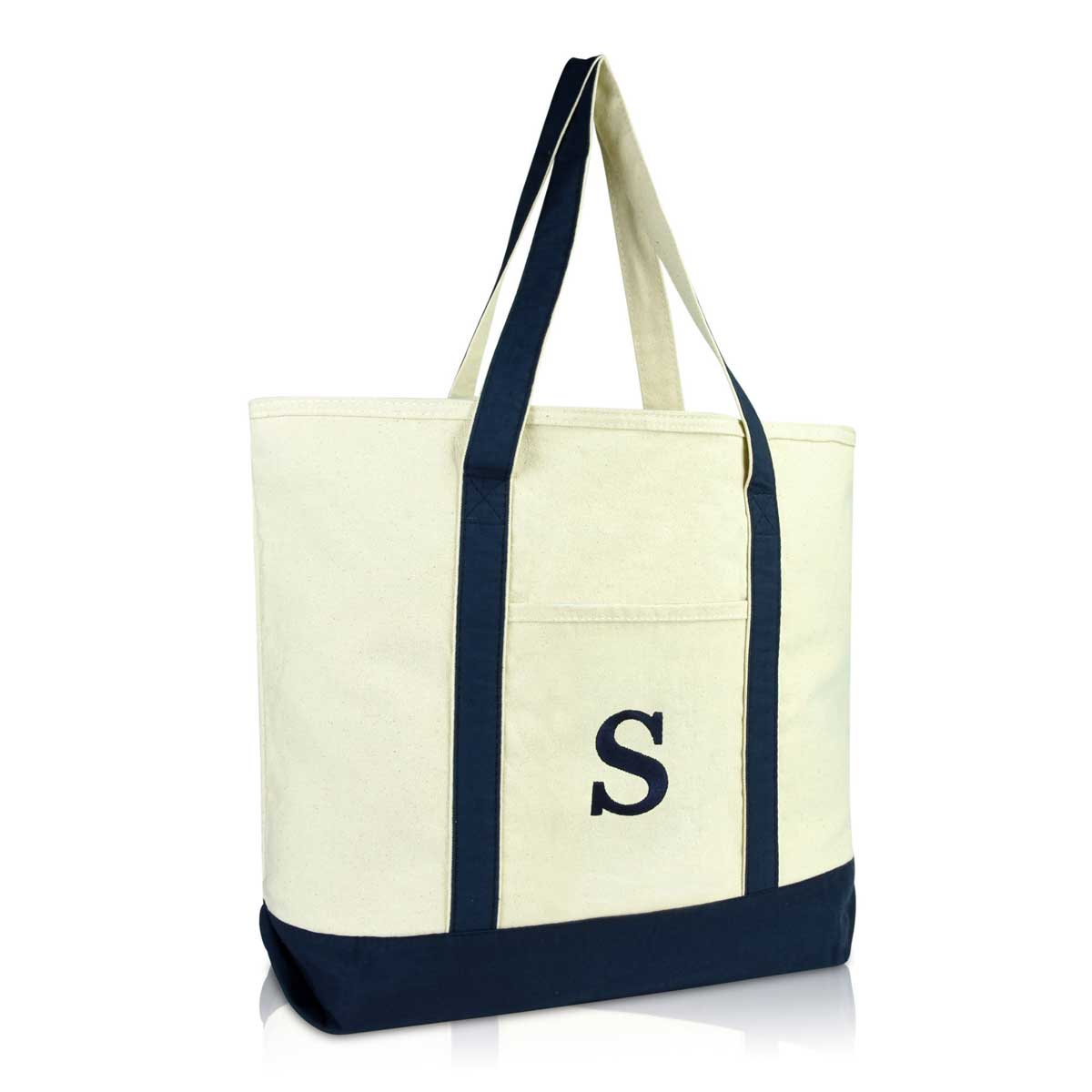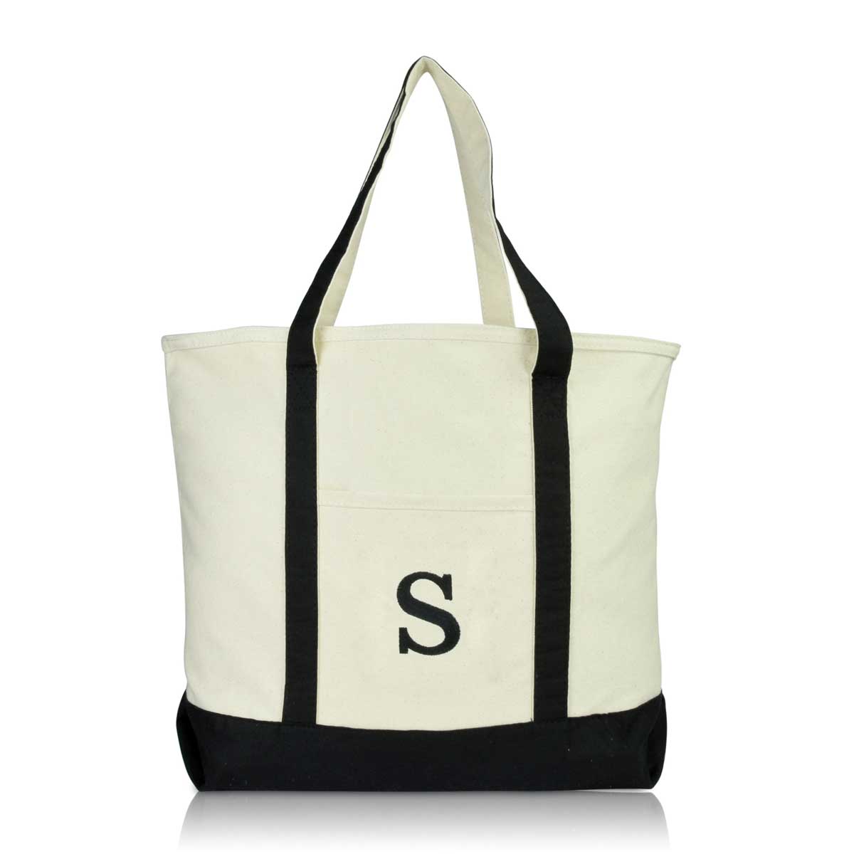 Our best selling DALIX tote for women of all ages, now features beautiful premium embroidery initial of your choice! Custom designed, our tote features a beautiful monogram letter "S" of your favorite name or word! Sewn with premium threading, each tote has a different color theme with a complementing letter color. We ensure an ever-lasting embroidery design on our tote bags. Suitable to carry on you for days out at the beach, grocery shopping at the market, or simply carrying it to work with you. And if you're a student or teacher, what better tote to carry into class with your textbooks and folders? It is also perfect as a personalized gift for weddings and holidays to your friends, family, or even if it is a special gift to yourself. This tote features a heavy duty 12 oz. cotton canvas material with a zipper closure for safety when you travel to ensure your accessories and belongings don't fall out. There is also a front pocket for accessories storage, and comes in more wonderful colors! For those on a budget but still wanting a quality product, this is a great gift under 20 dollars which will last for time to come