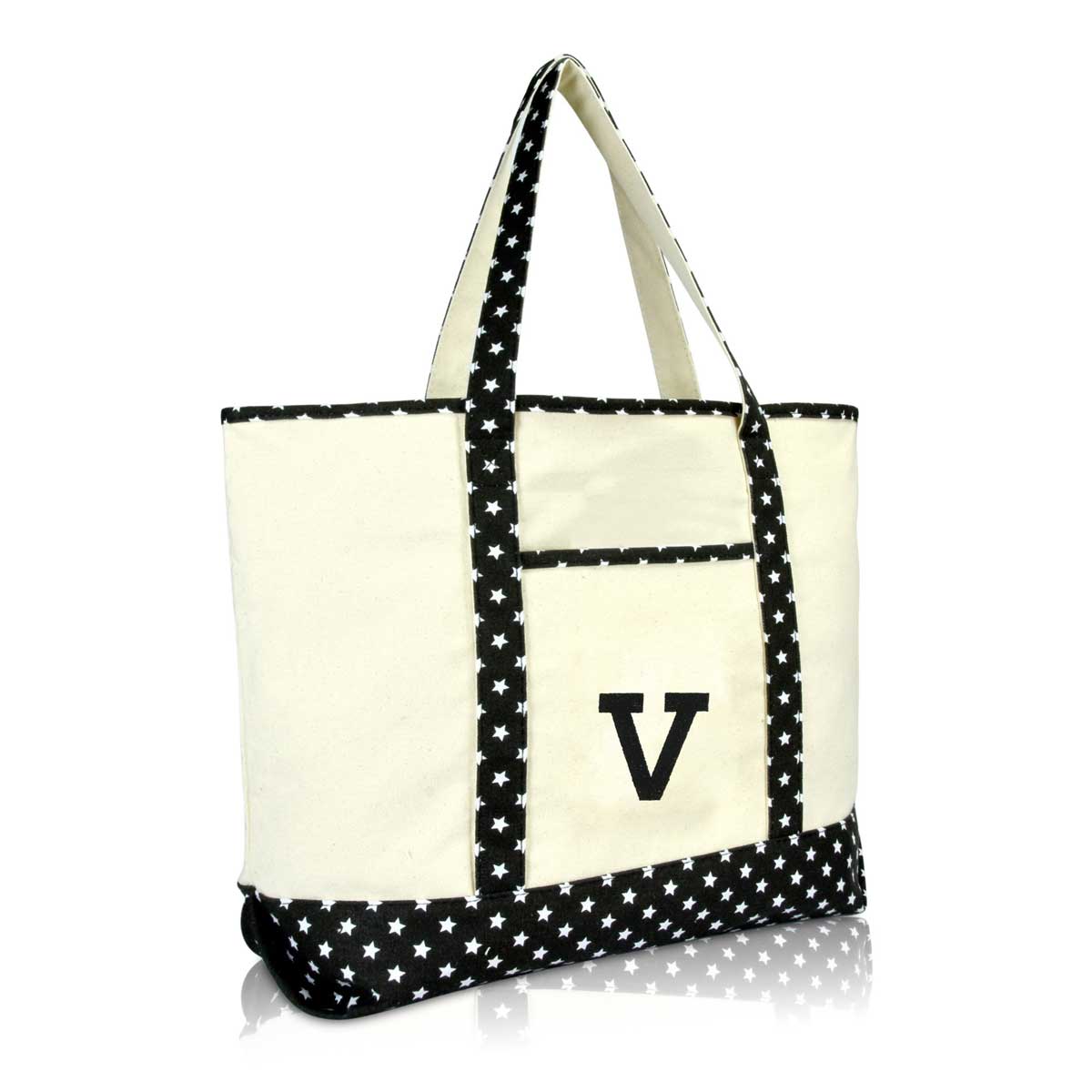Our best selling DALIX tote for women of all ages, now features beautiful premium embroidery initial of your choice! Custom designed, our tote features a beautiful monogram letter "V" of your favorite name or word! Sewn with premium threading, each tote has a different color theme with a complementing letter color. We ensure an ever-lasting embroidery design on our tote bags. Suitable to carry on you for days out at the beach, grocery shopping at the market, or simply carrying it to work with you. And if you're a student or teacher, what better tote to carry into class with your textbooks and folders? It is also perfect as a personalized gift for weddings and holidays to your friends, family, or even if it is a special gift to yourself. This tote features a heavy duty 12 oz. cotton canvas material with a zipper closure for safety when you travel to ensure your accessories and belongings don't fall out. There is also a front pocket for accessories storage, and comes in more wonderful colors! For those on a budget but still wanting a quality product, this is a great gift under 20 dollars which will last for time to come.