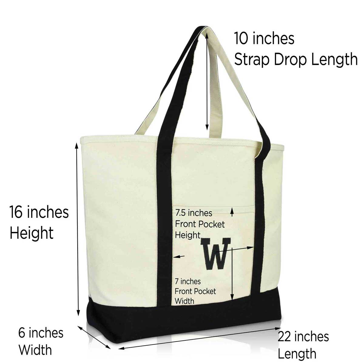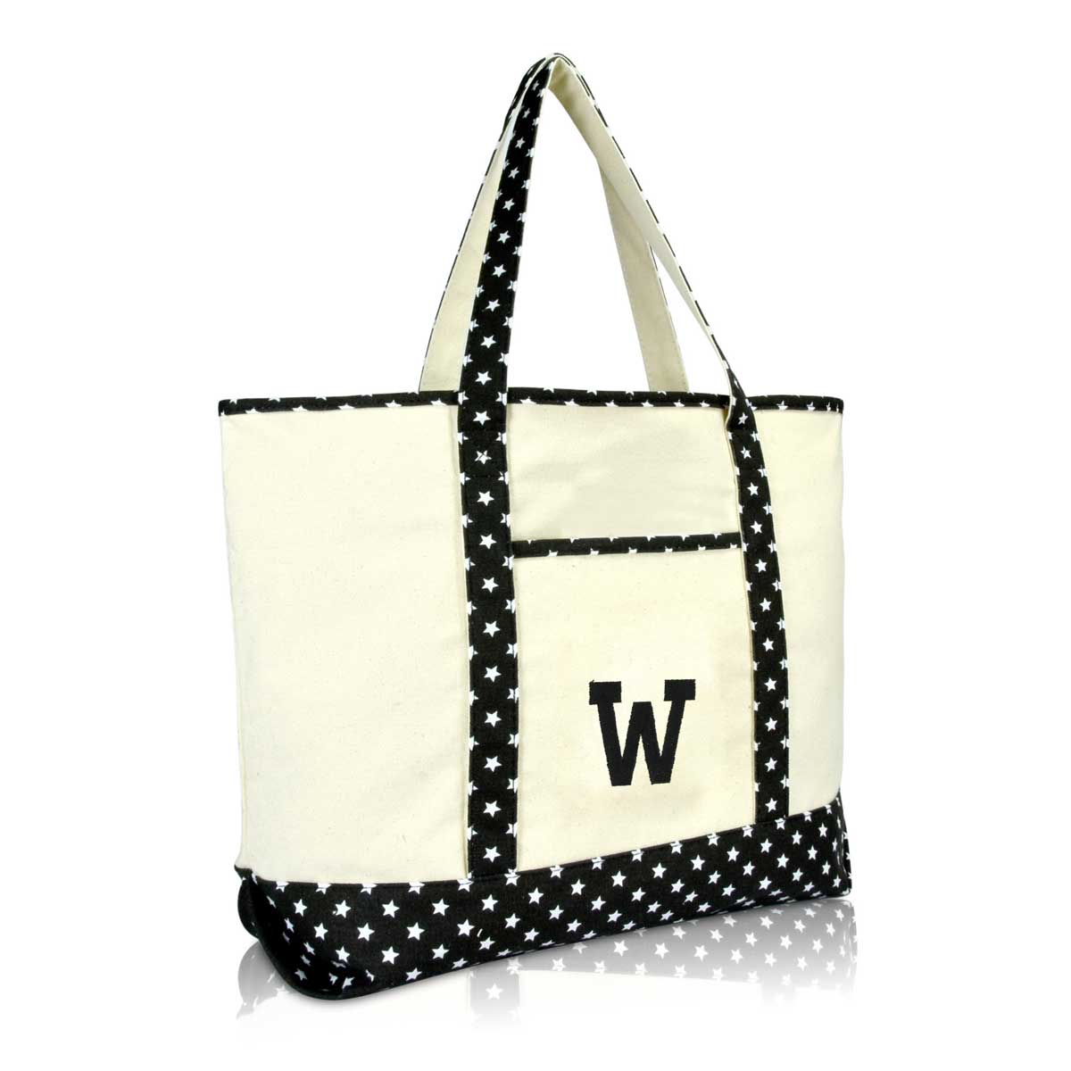 Our best selling DALIX tote for women of all ages, now features beautiful premium embroidery initial of your choice! Custom designed, our tote features a beautiful monogram letter "W" of your favorite name or word! Sewn with premium threading, each tote has a different color theme with a complementing letter color. We ensure an ever-lasting embroidery design on our tote bags. Suitable to carry on you for days out at the beach, grocery shopping at the market, or simply carrying it to work with you. And if you're a student or teacher, what better tote to carry into class with your textbooks and folders? It is also perfect as a personalized gift for weddings and holidays to your friends, family, or even if it is a special gift to yourself. This tote features a heavy duty 12 oz. cotton canvas material with a zipper closure for safety when you travel to ensure your accessories and belongings don't fall out. There is also a front pocket for accessories storage, and comes in more wonderful colors! For those on a budget but still wanting a quality product, this is a great gift under 20 dollars which will last for time to come.