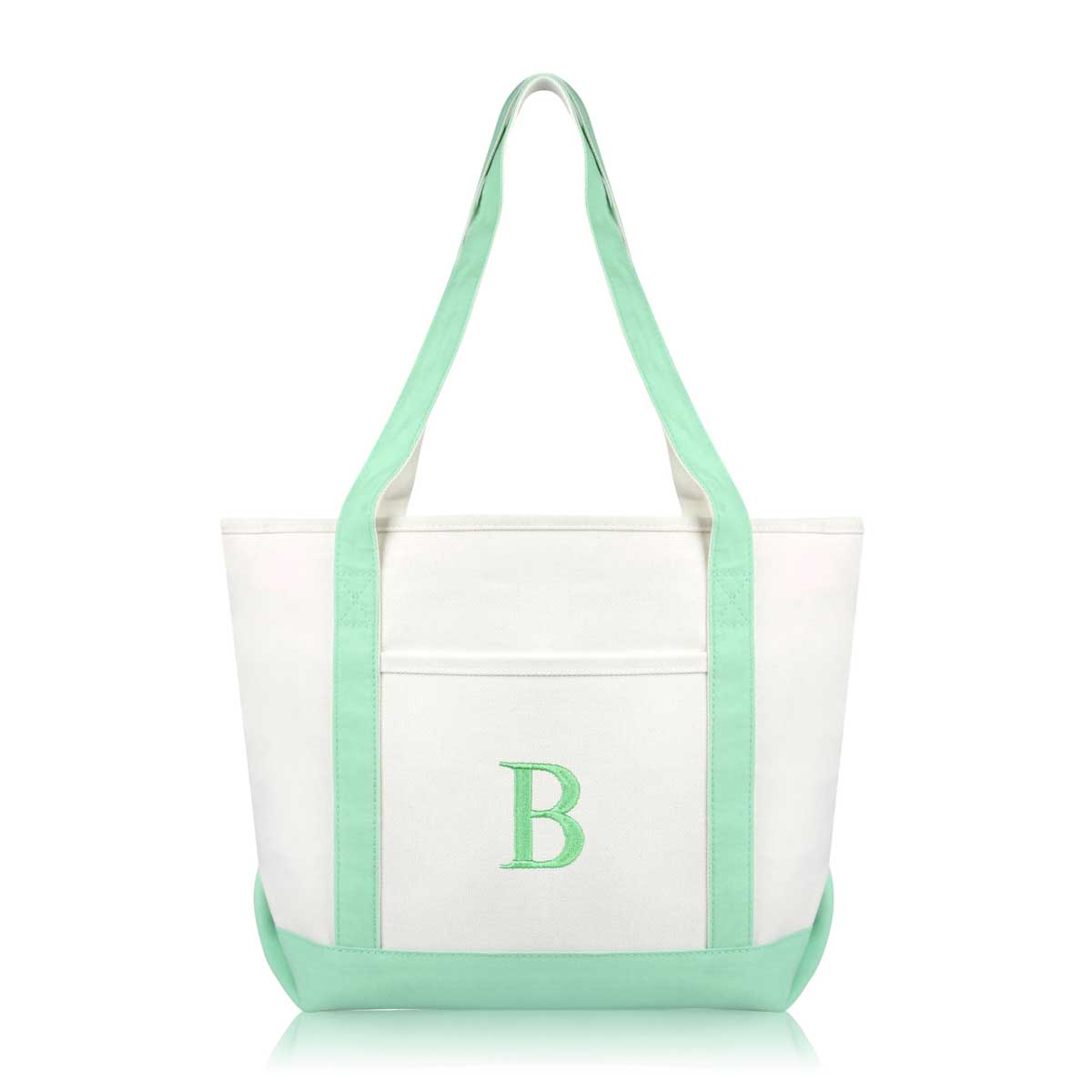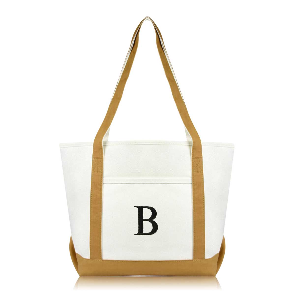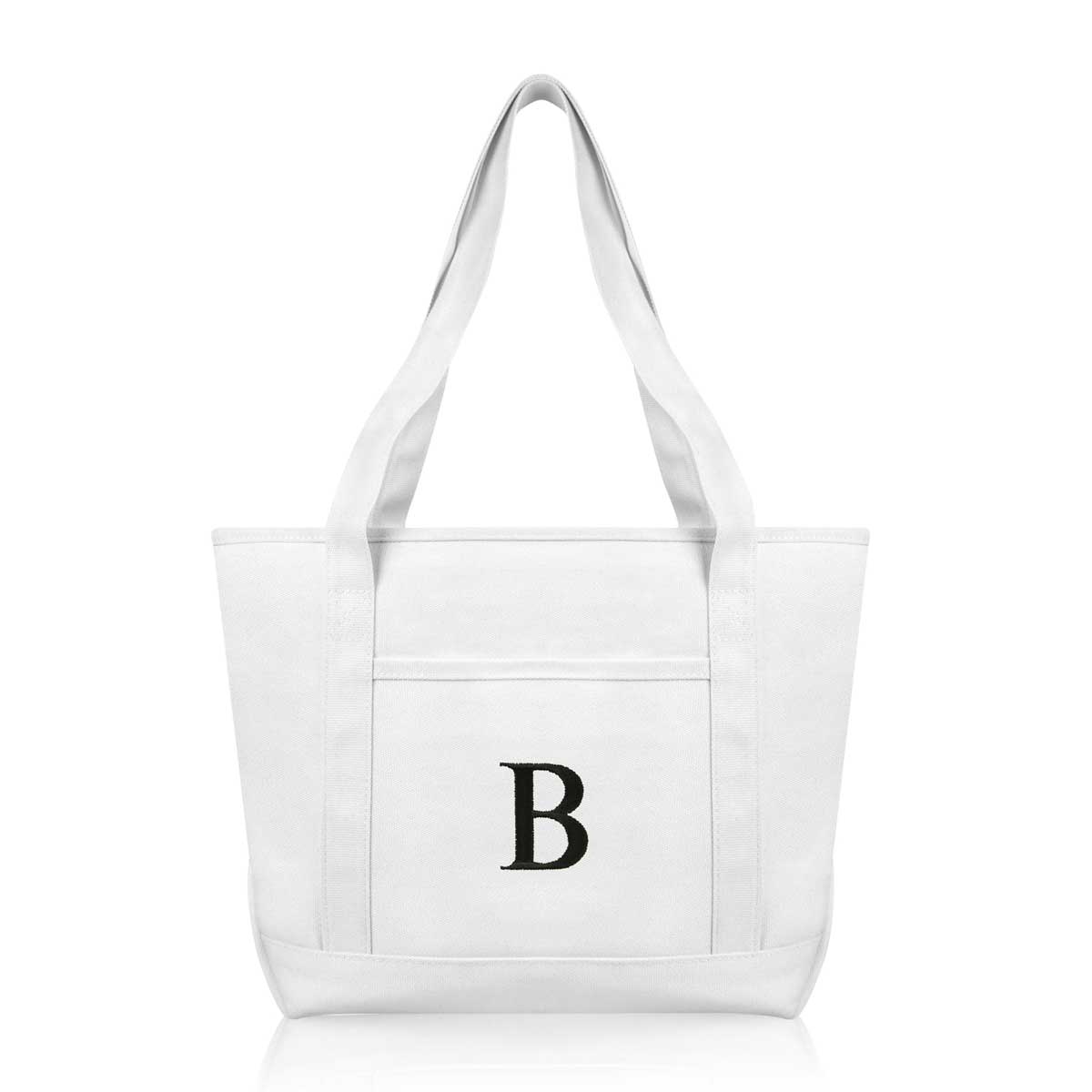DALIX Initial Letter B custom embroidered tote bags feature heavy duty cotton canvas and a lovely design. Every bag is stitched with care, allowing you to express your initial, and sure to impress. Made for women fitting any occasion, this shoulder bag is generous in sizing and includes a front pocket, zippered top, keychain holder, and inner zippered pocket.