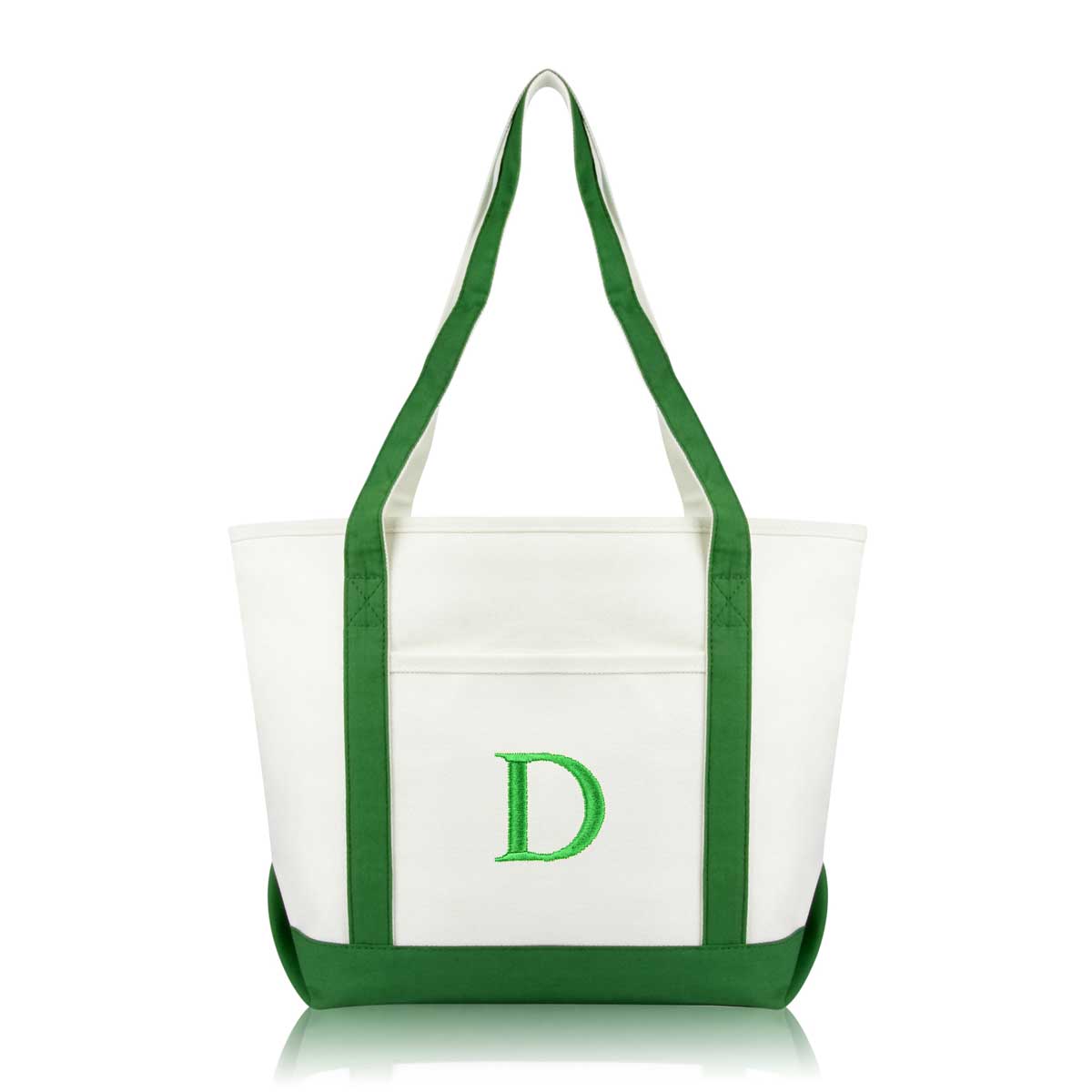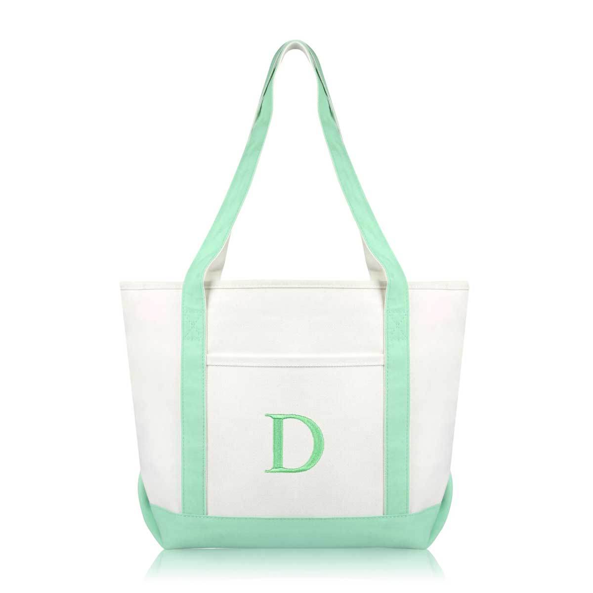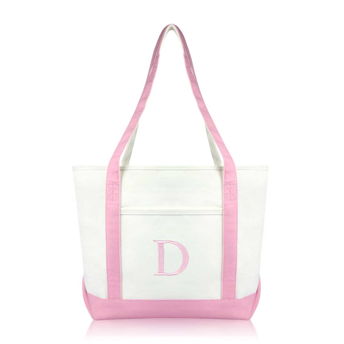 DALIX Initial Letter D custom embroidered tote bags feature heavy duty cotton canvas and a lovely design. Every bag is stitched with care, allowing you to express your initial, and sure to impress. Made for women fitting any occasion, this shoulder bag is generous in sizing and includes a front pocket, zippered top, keychain holder, and inner zippered pocket.
