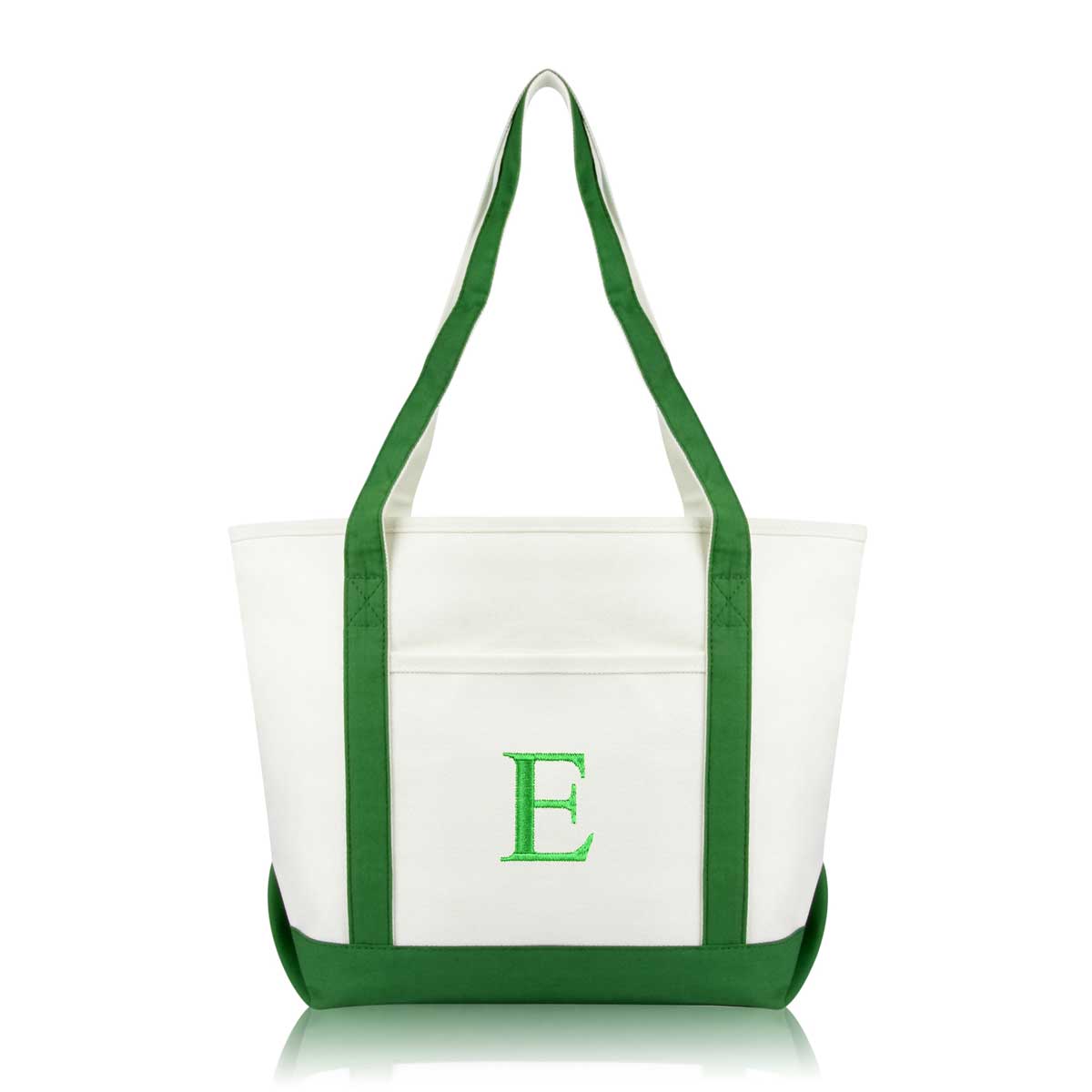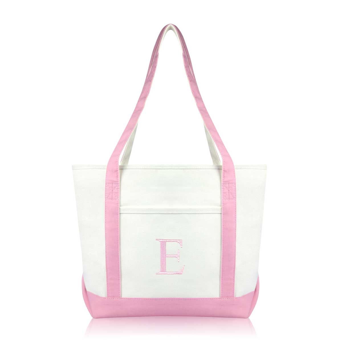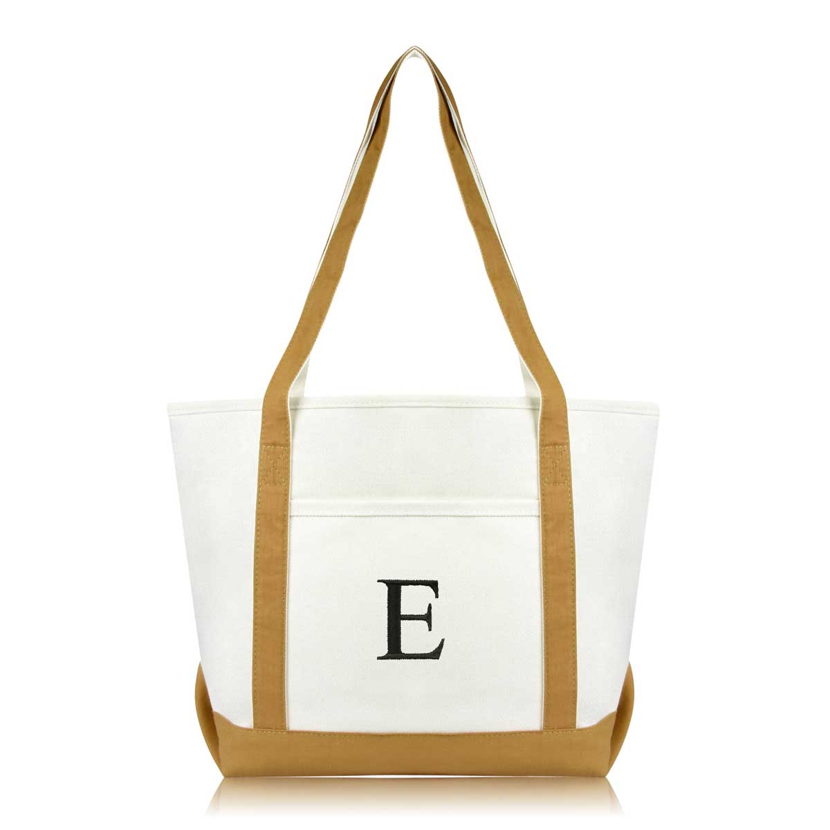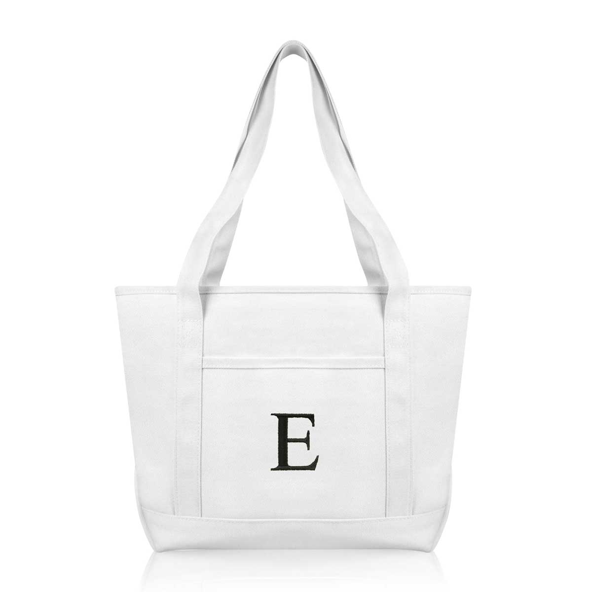DALIX Initial Letter E custom embroidered tote bags feature heavy duty cotton canvas and a lovely design. Every bag is stitched with care, allowing you to express your initial, and sure to impress. Made for women fitting any occasion, this shoulder bag is generous in sizing and includes a front pocket, zippered top, keychain holder, and inner zippered pocket.