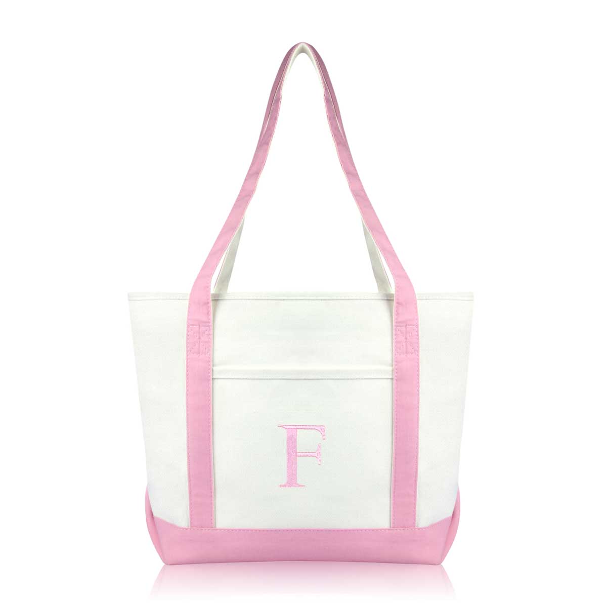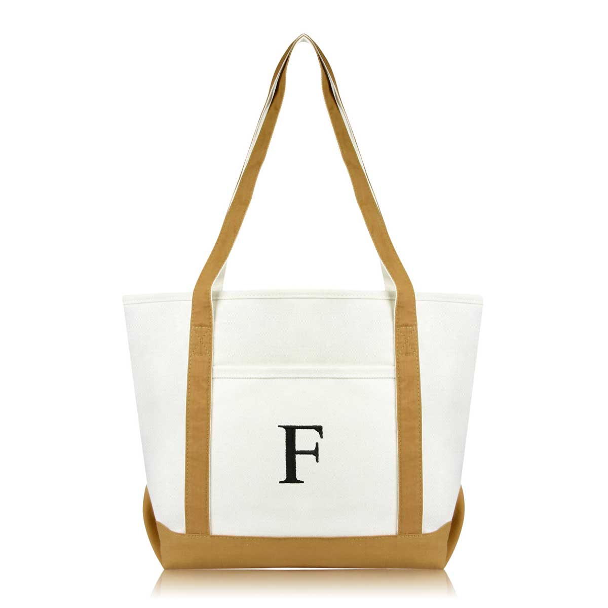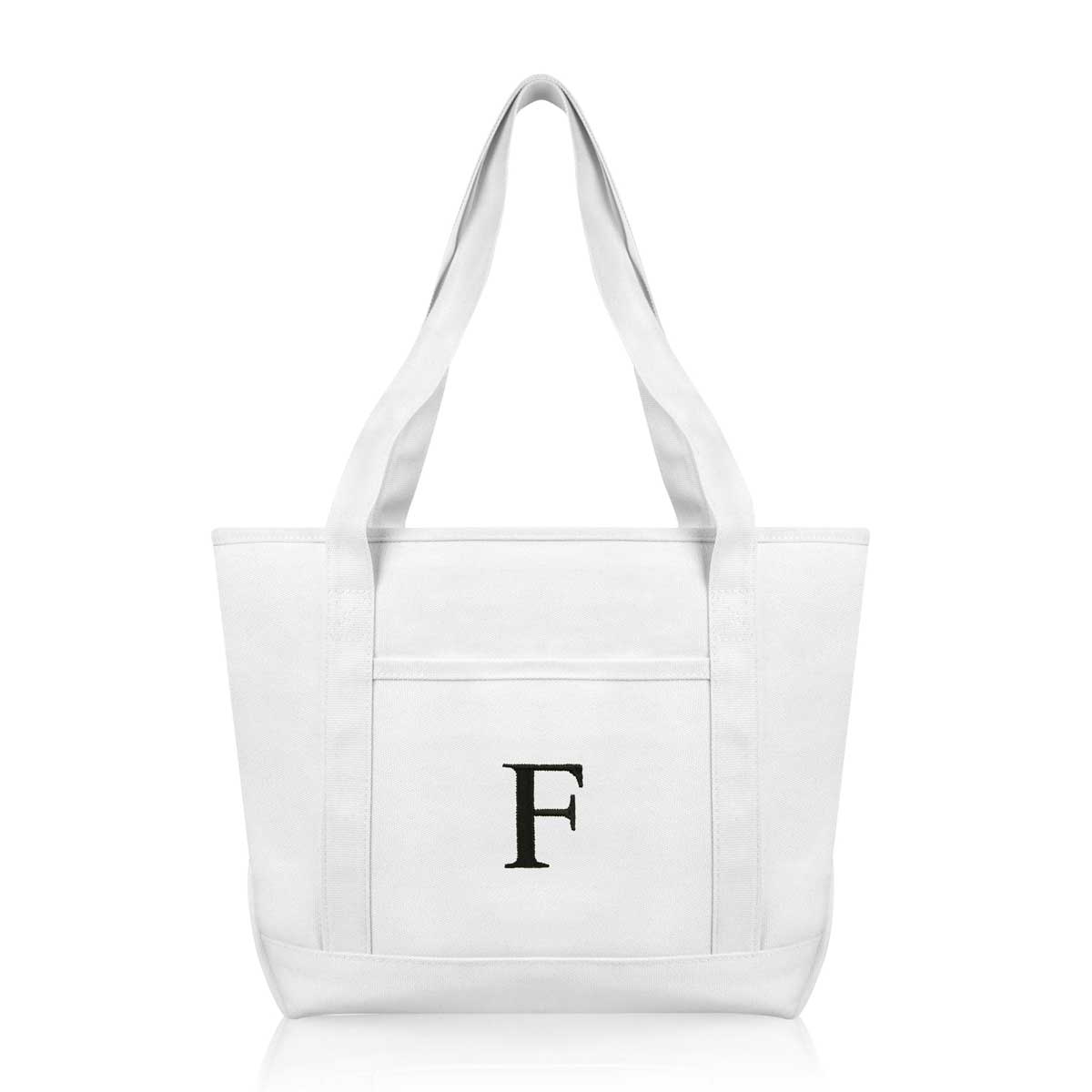 DALIX Initial Letter F custom embroidered tote bags feature heavy duty cotton canvas and a lovely design. Every bag is stitched with care, allowing you to express your initial, and sure to impress. Made for women fitting any occasion, this shoulder bag is generous in sizing and includes a front pocket, zippered top, keychain holder, and inner zippered pocket.