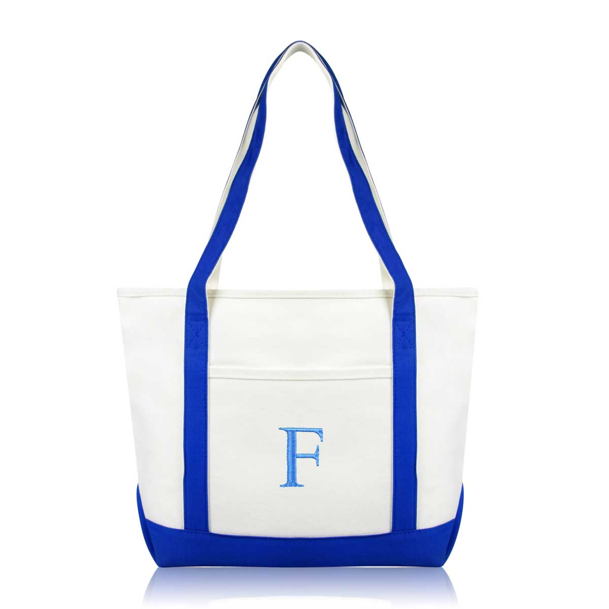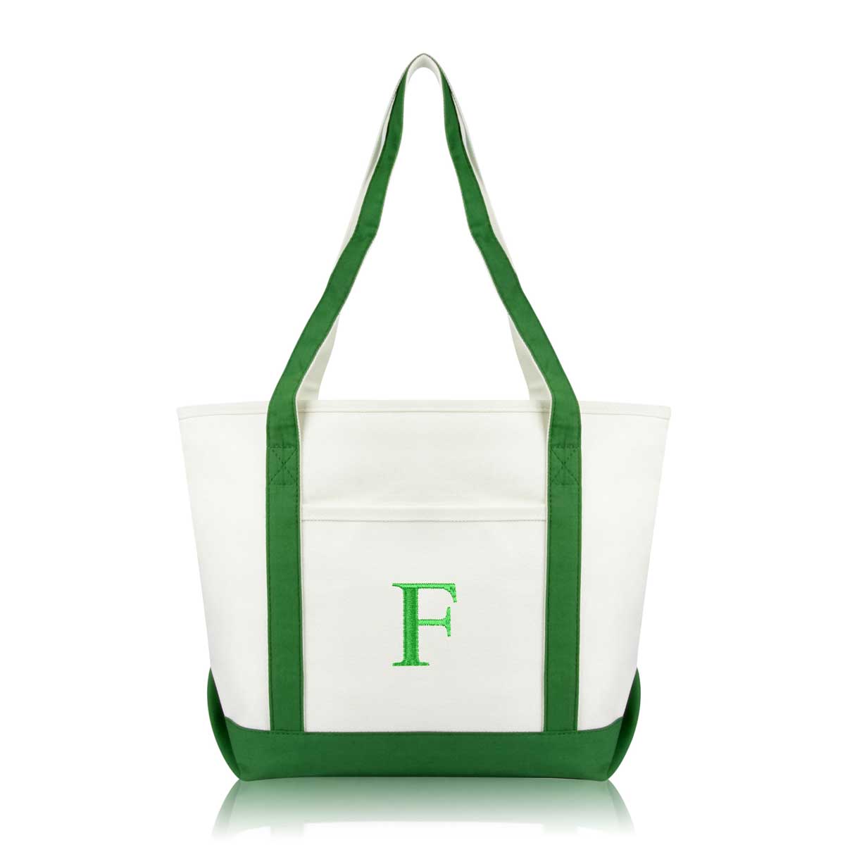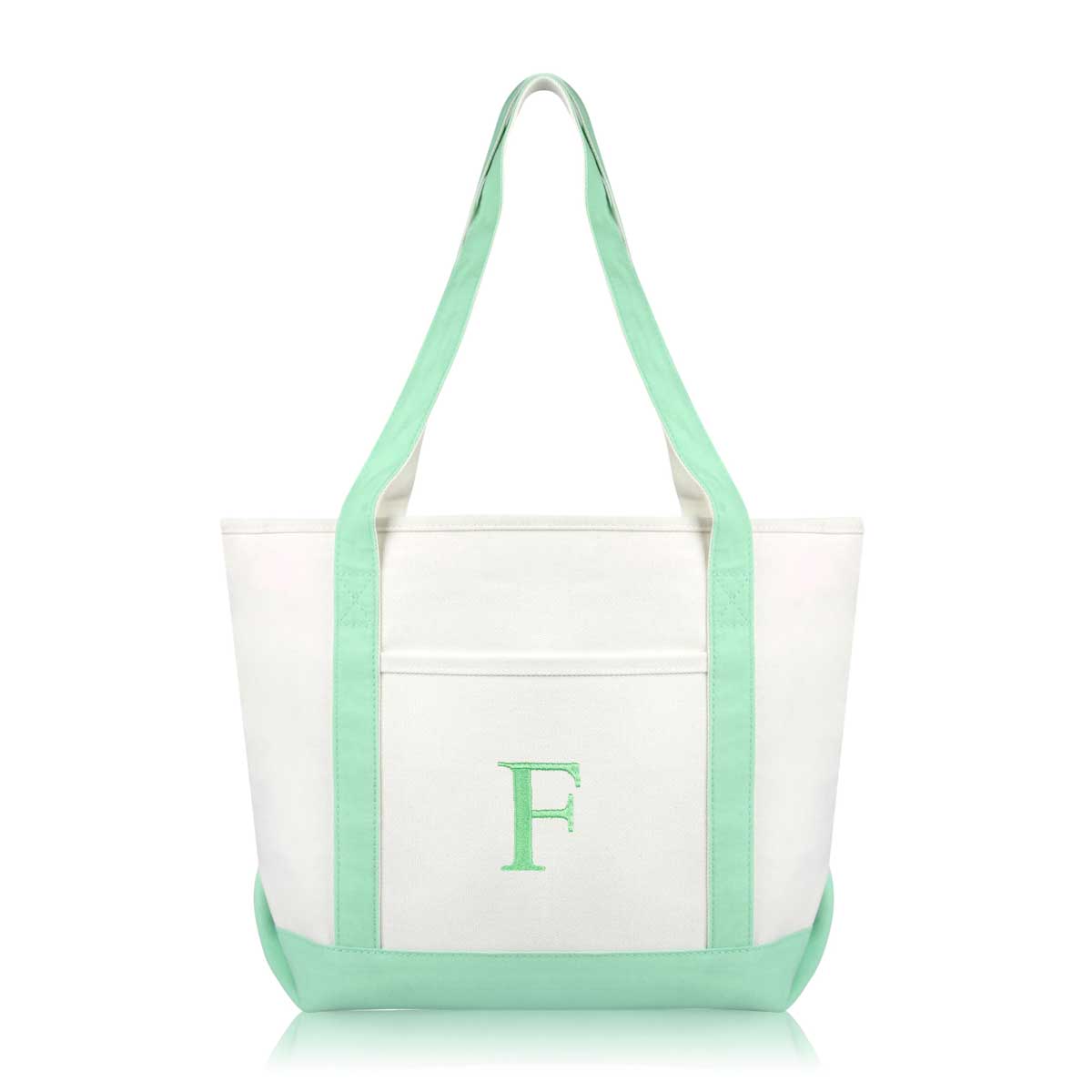 DALIX Initial Letter F custom embroidered tote bags feature heavy duty cotton canvas and a lovely design. Every bag is stitched with care, allowing you to express your initial, and sure to impress. Made for women fitting any occasion, this shoulder bag is generous in sizing and includes a front pocket, zippered top, keychain holder, and inner zippered pocket.