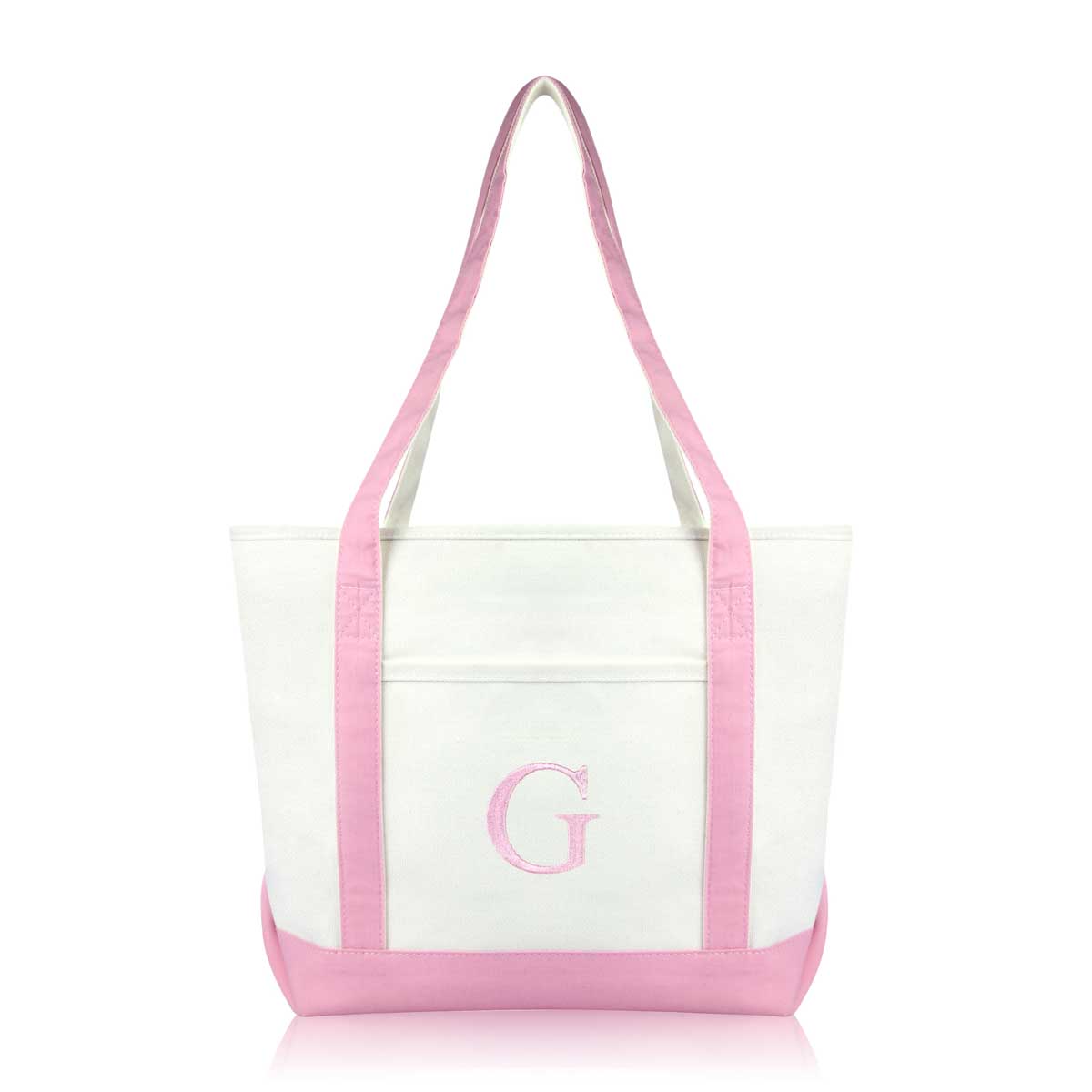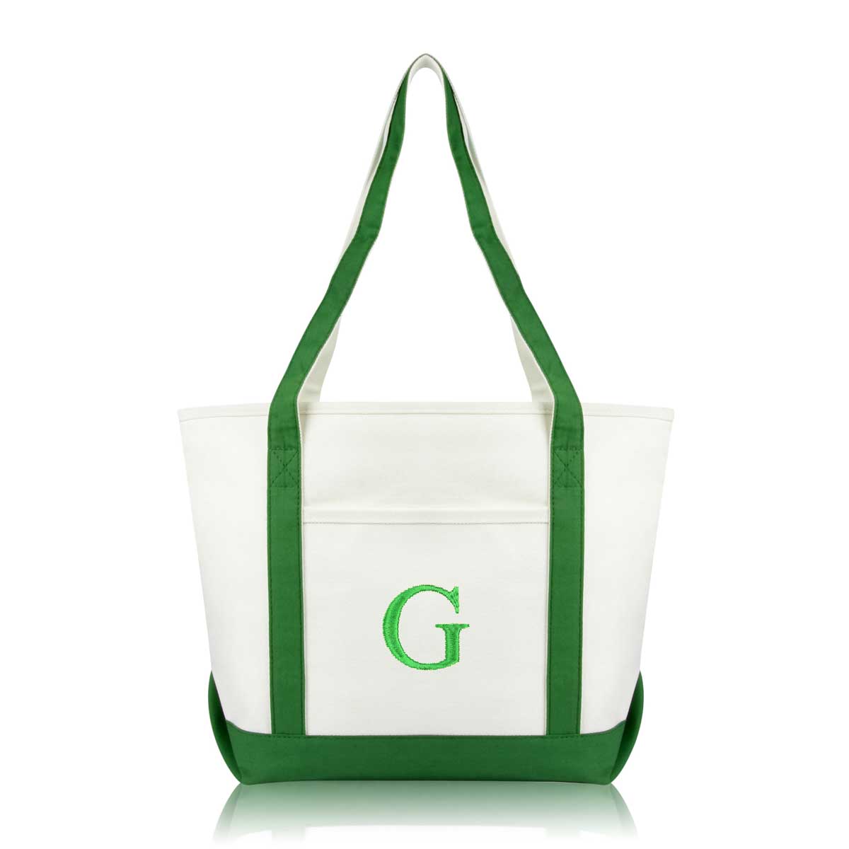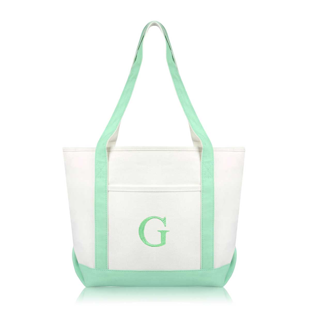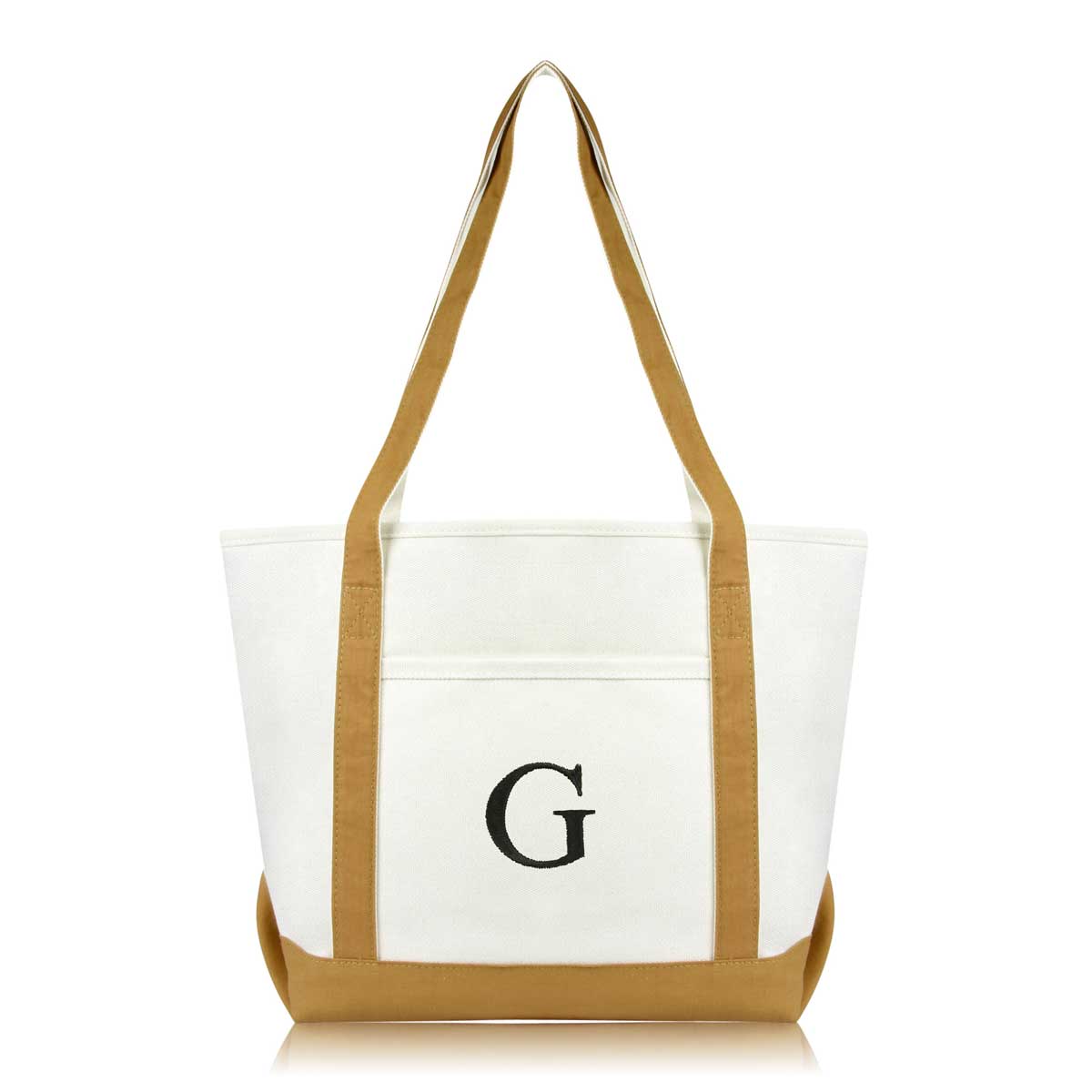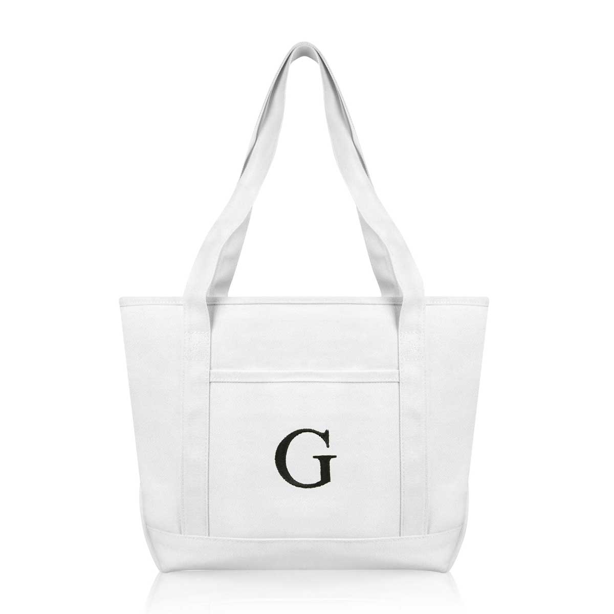 DALIX Initial Letter G custom embroidered tote bags feature heavy duty cotton canvas and a lovely design. Every bag is stitched with care, allowing you to express your initial, and sure to impress. Made for women fitting any occasion, this shoulder bag is generous in sizing and includes a front pocket, zippered top, keychain holder, and inner zippered pocket.