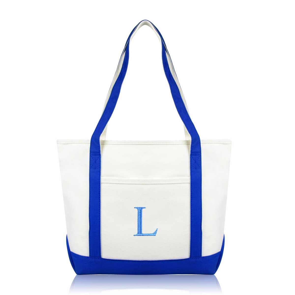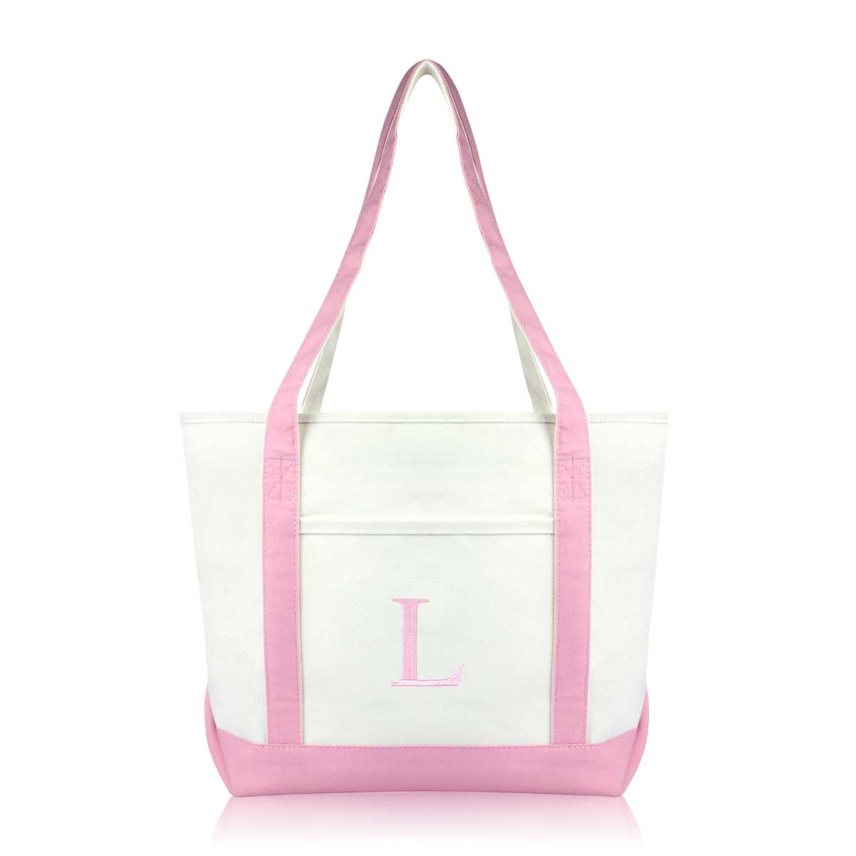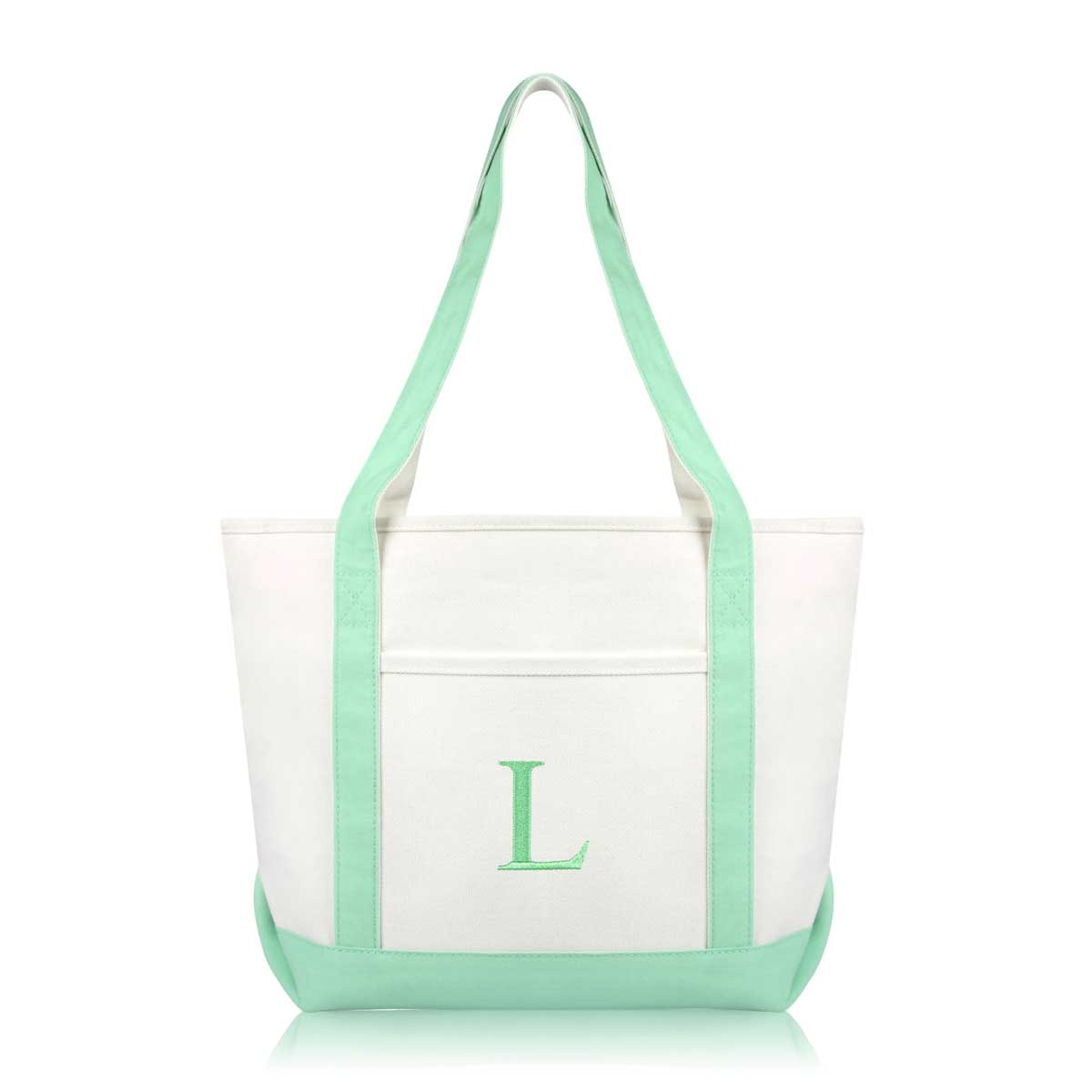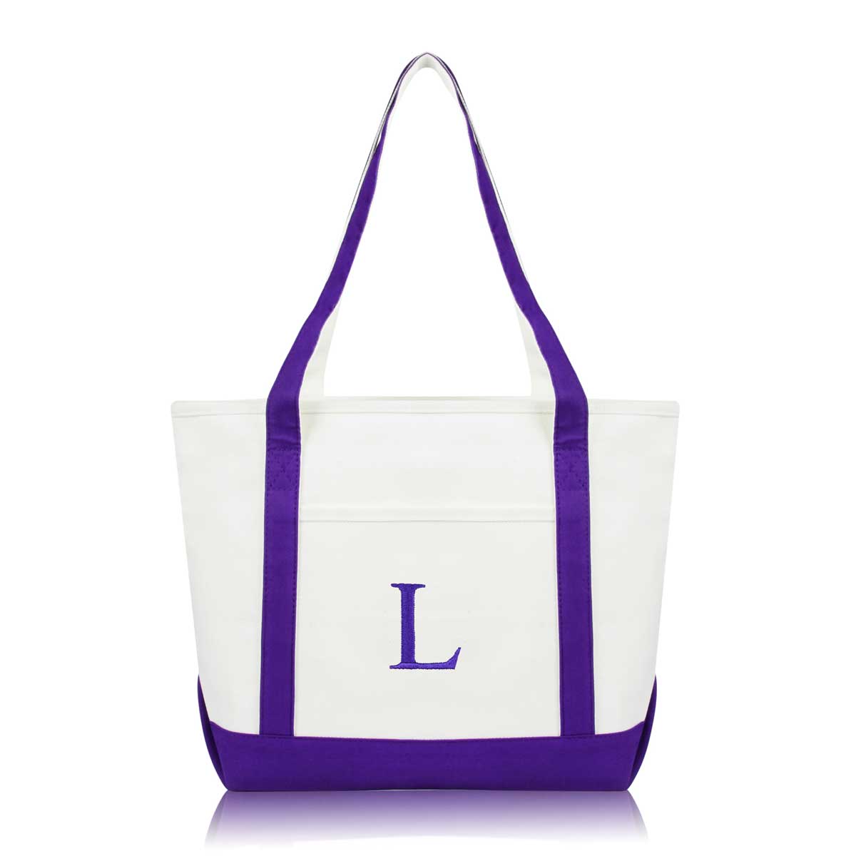 DALIX Initial Letter L custom embroidered tote bags feature heavy duty cotton canvas and a lovely design. Every bag is stitched with care, allowing you to express your initial, and sure to impress. Made for women fitting any occasion, this shoulder bag is generous in sizing and includes a front pocket, zippered top, keychain holder, and inner zippered pocket.