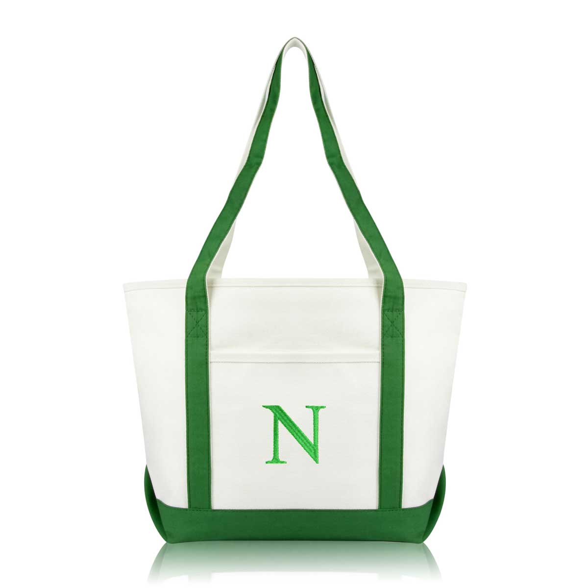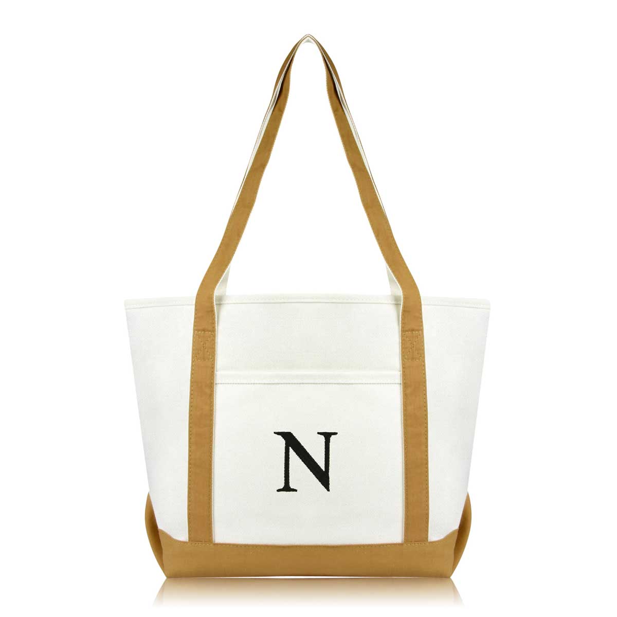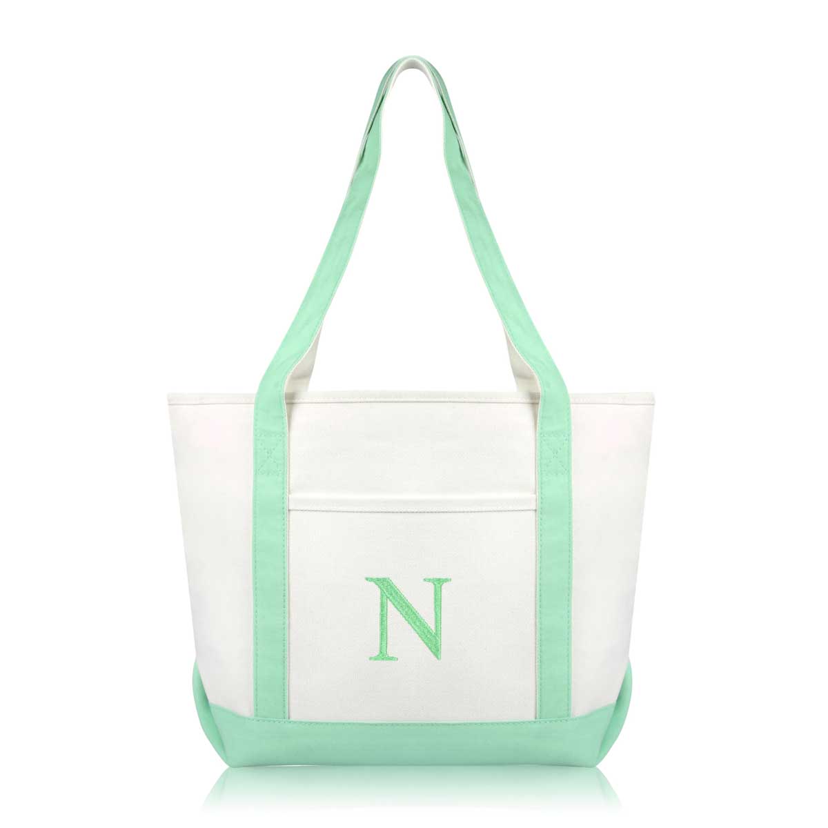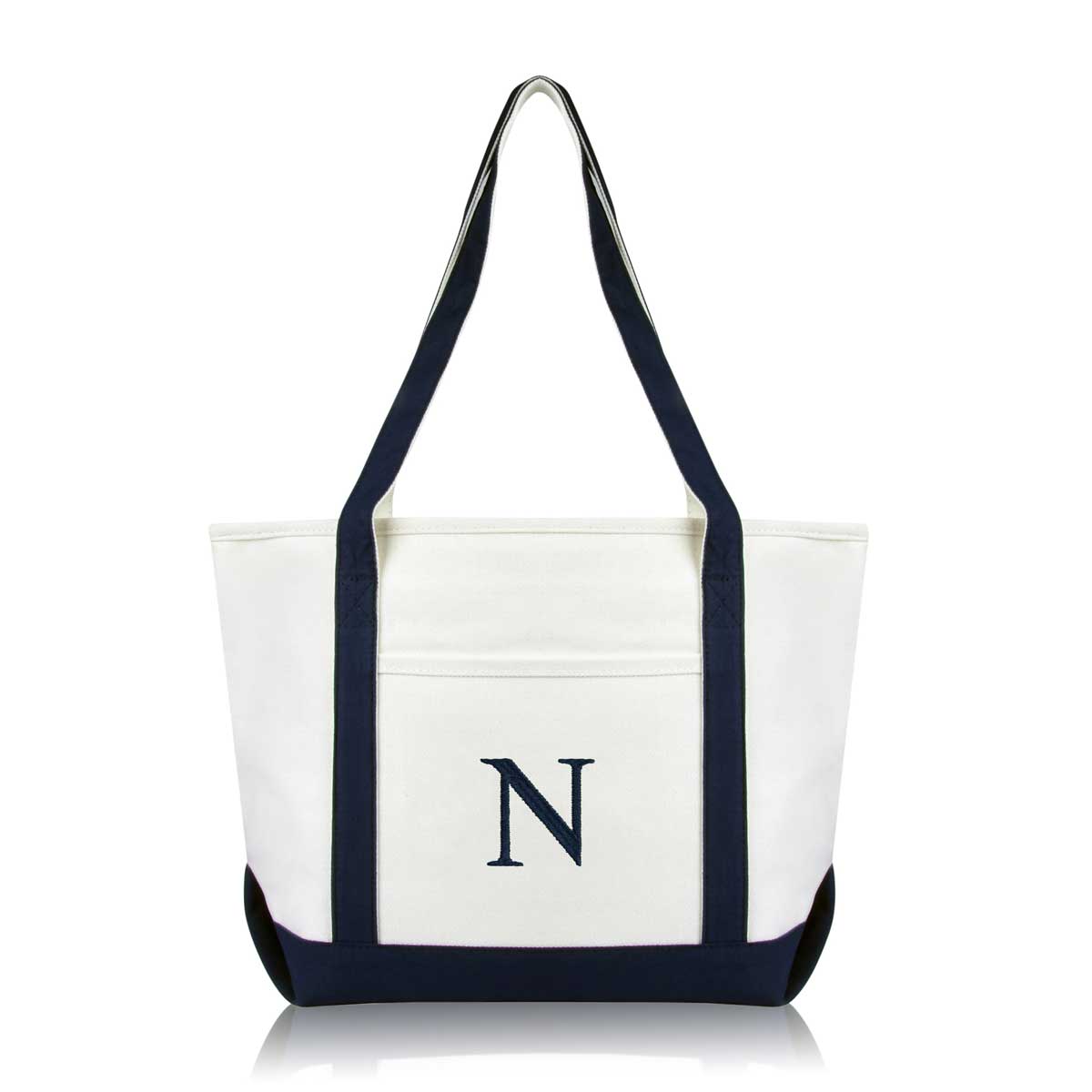 DALIX Initial Letter N custom embroidered tote bags feature heavy duty cotton canvas and a lovely design. Every bag is stitched with care, allowing you to express your initial, and sure to impress. Made for women fitting any occasion, this shoulder bag is generous in sizing and includes a front pocket, zippered top, keychain holder, and inner zippered pocket.