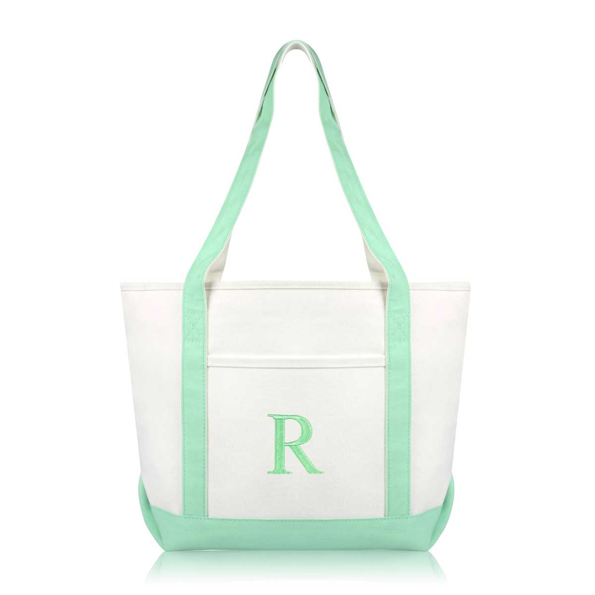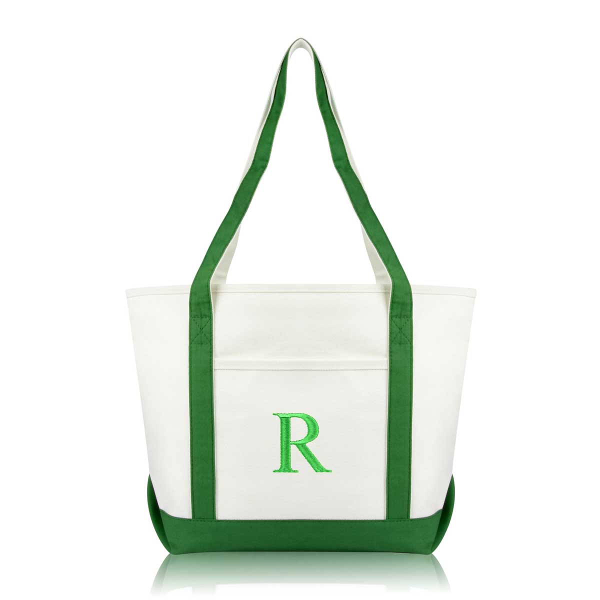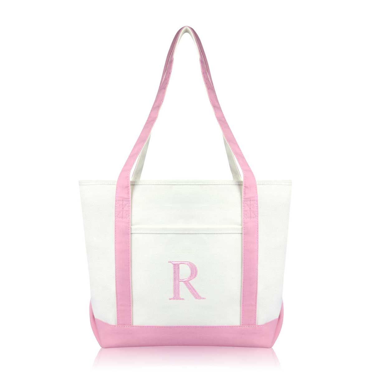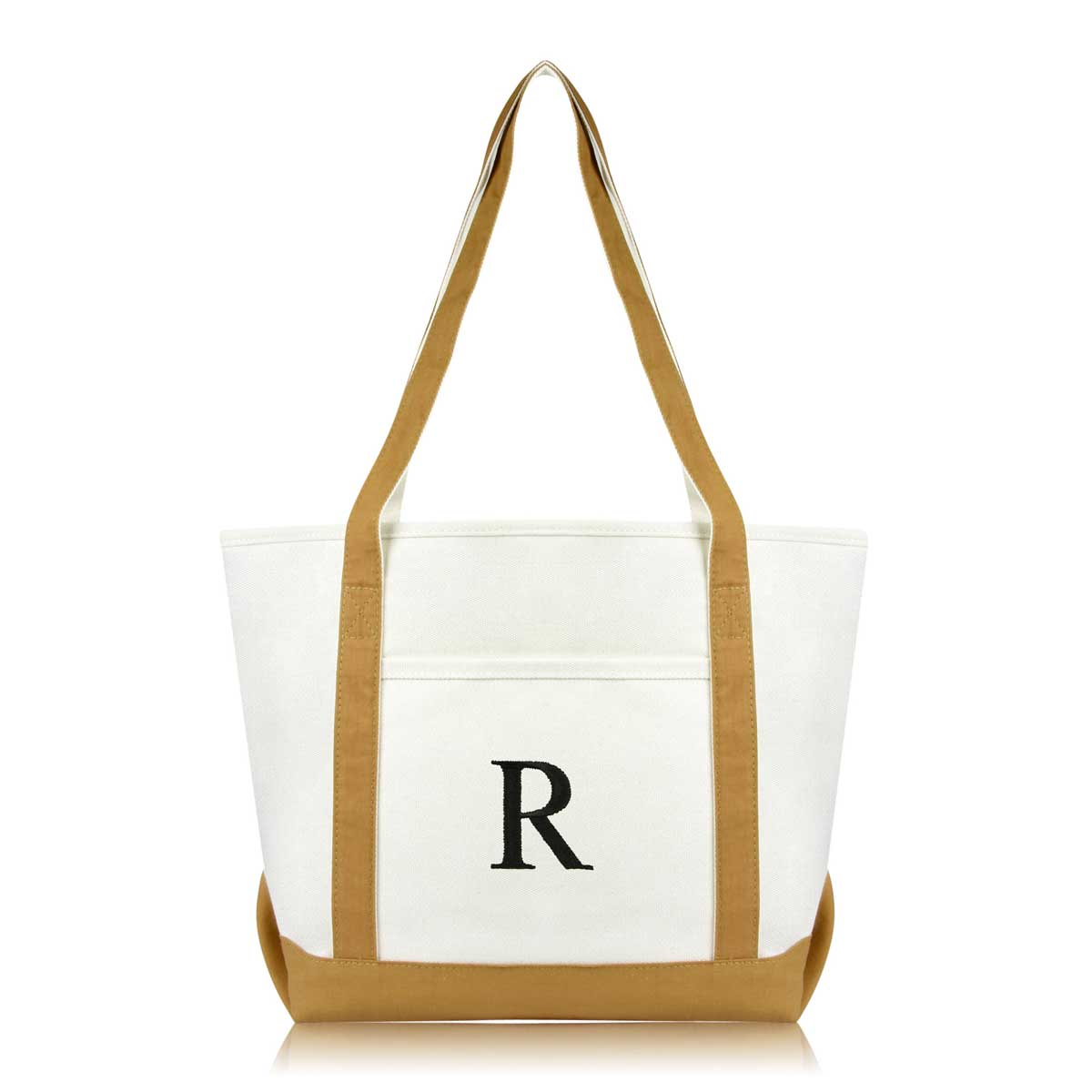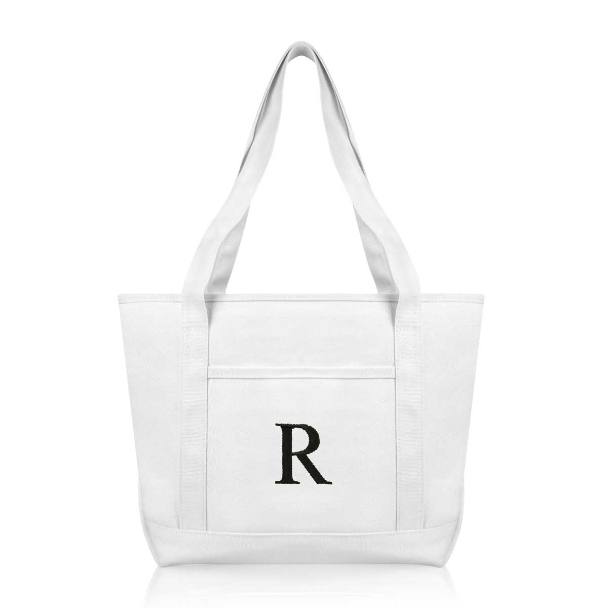 DALIX Initial Letter R custom embroidered tote bags feature heavy duty cotton canvas and a lovely design. Every bag is stitched with care, allowing you to express your initial, and sure to impress. Made for women fitting any occasion, this shoulder bag is generous in sizing and includes a front pocket, zippered top, keychain holder, and inner zippered pocket.