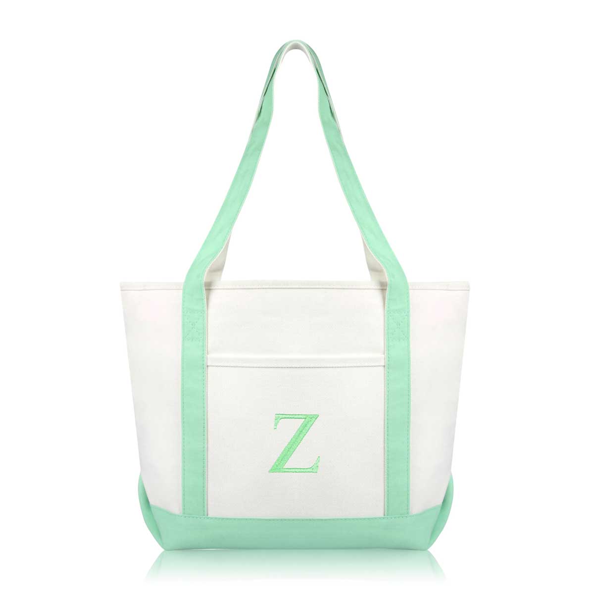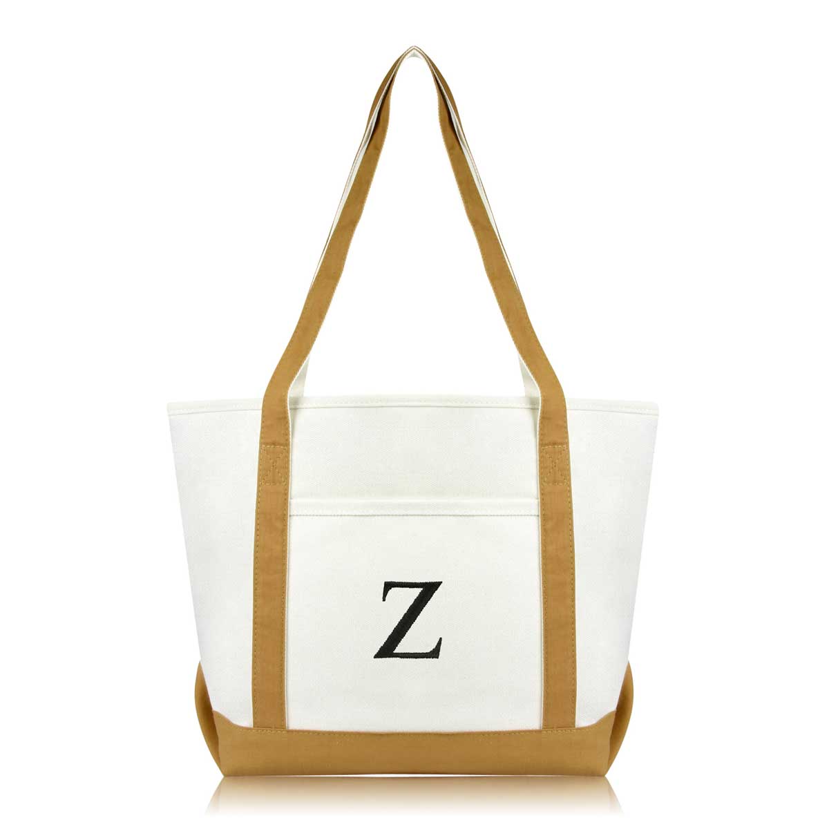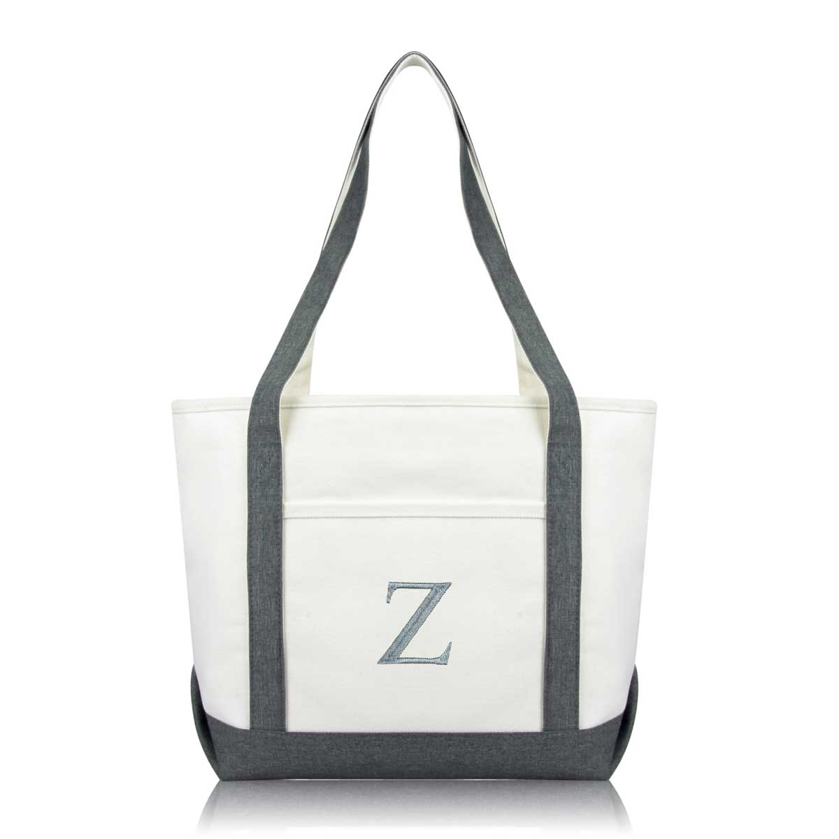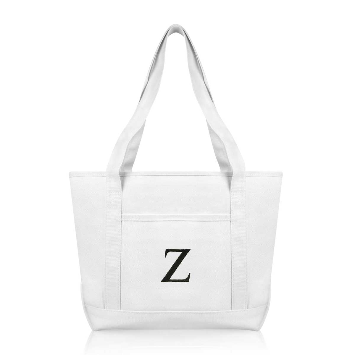 DALIX Initial Letter Z custom embroidered tote bags feature heavy duty cotton canvas and a lovely design. Every bag is stitched with care, allowing you to express your initial, and sure to impress. Made for women fitting any occasion, this shoulder bag is generous in sizing and includes a front pocket, zippered top, keychain holder, and inner zippered pocket.