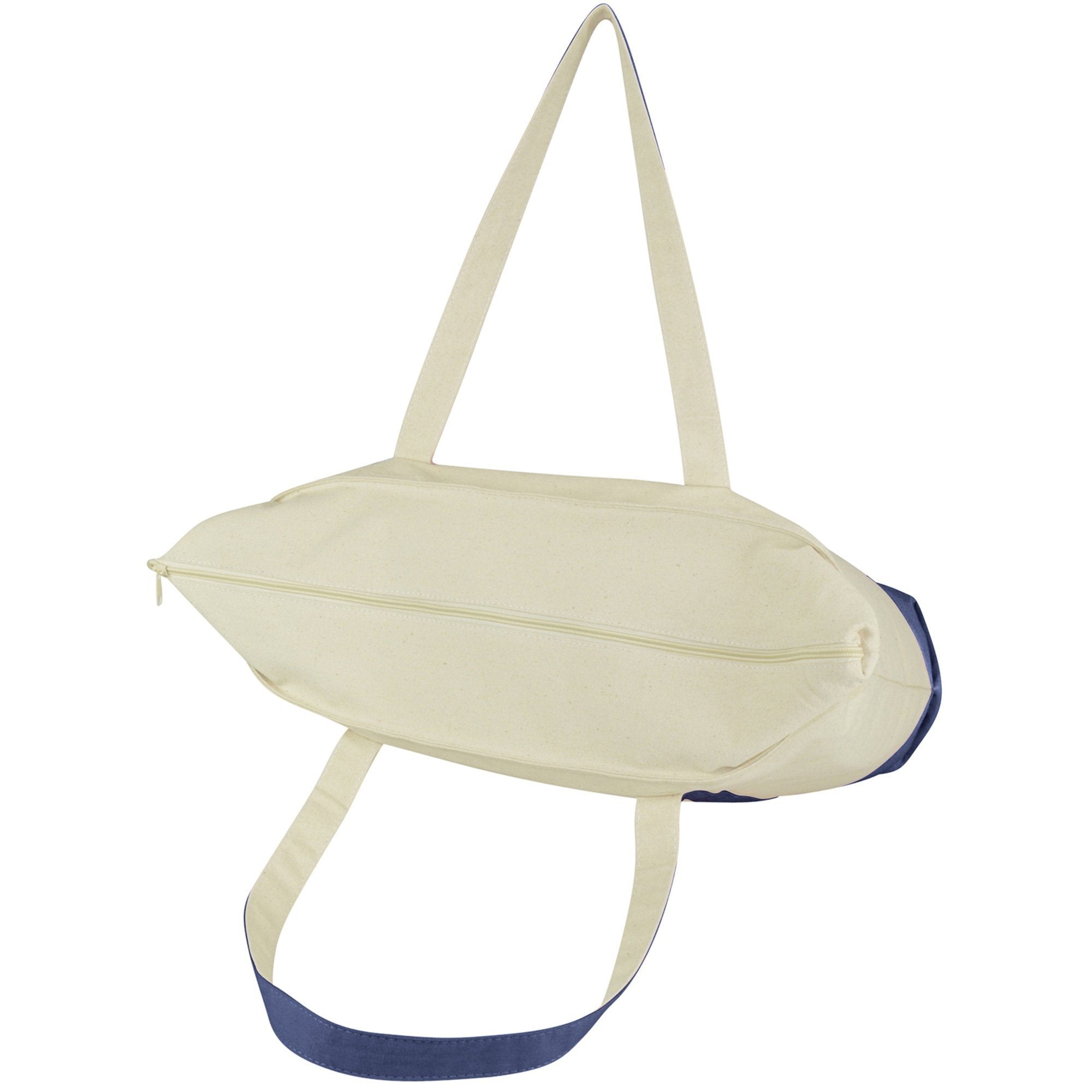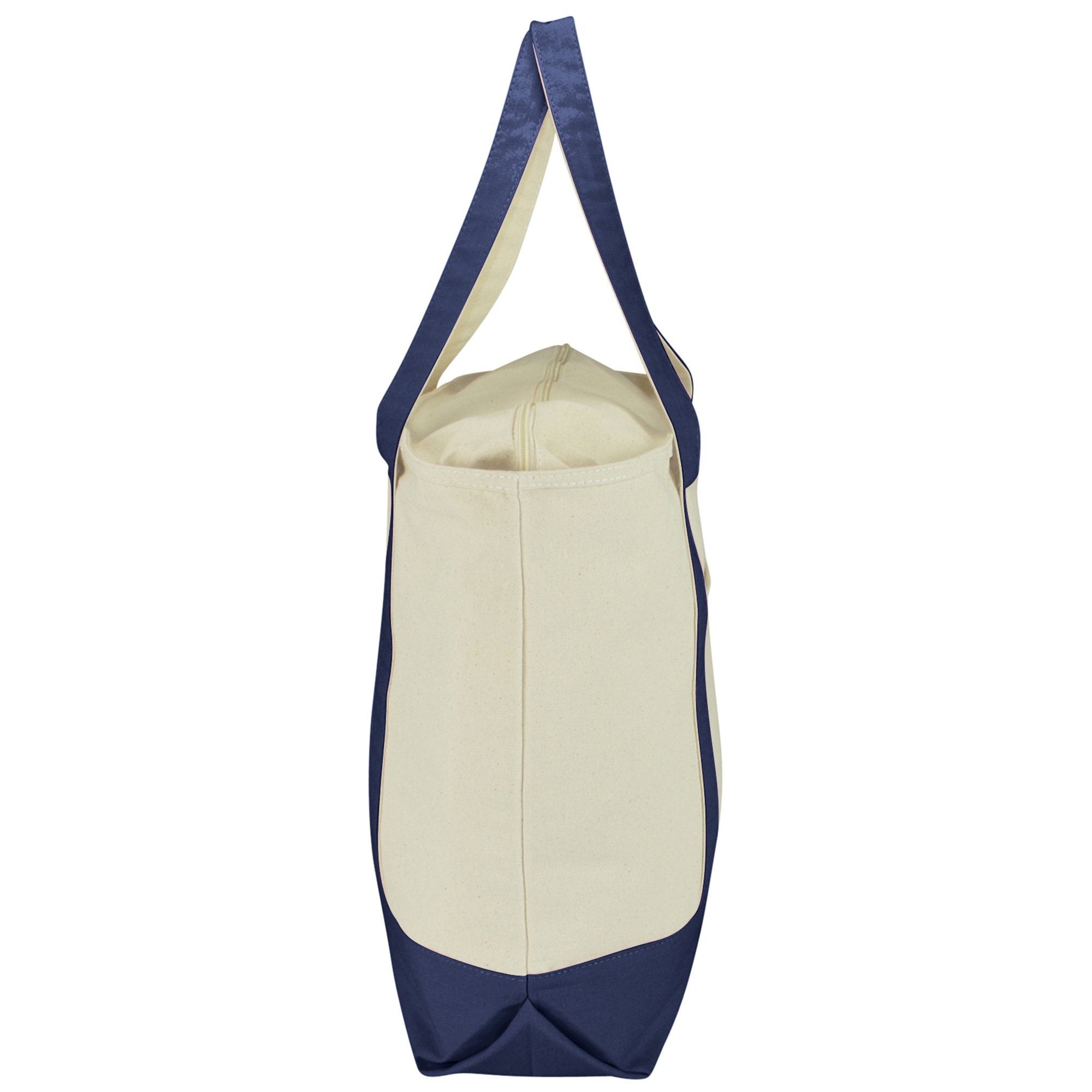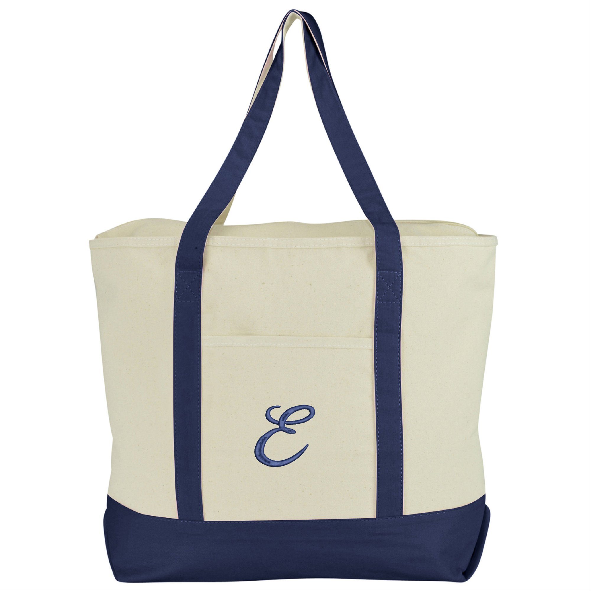 - FEATURES: Custom Embroidered Letter in Navy Blue. Heavy Duty Shopping Tote with Large top zipper w/ front open pocket.