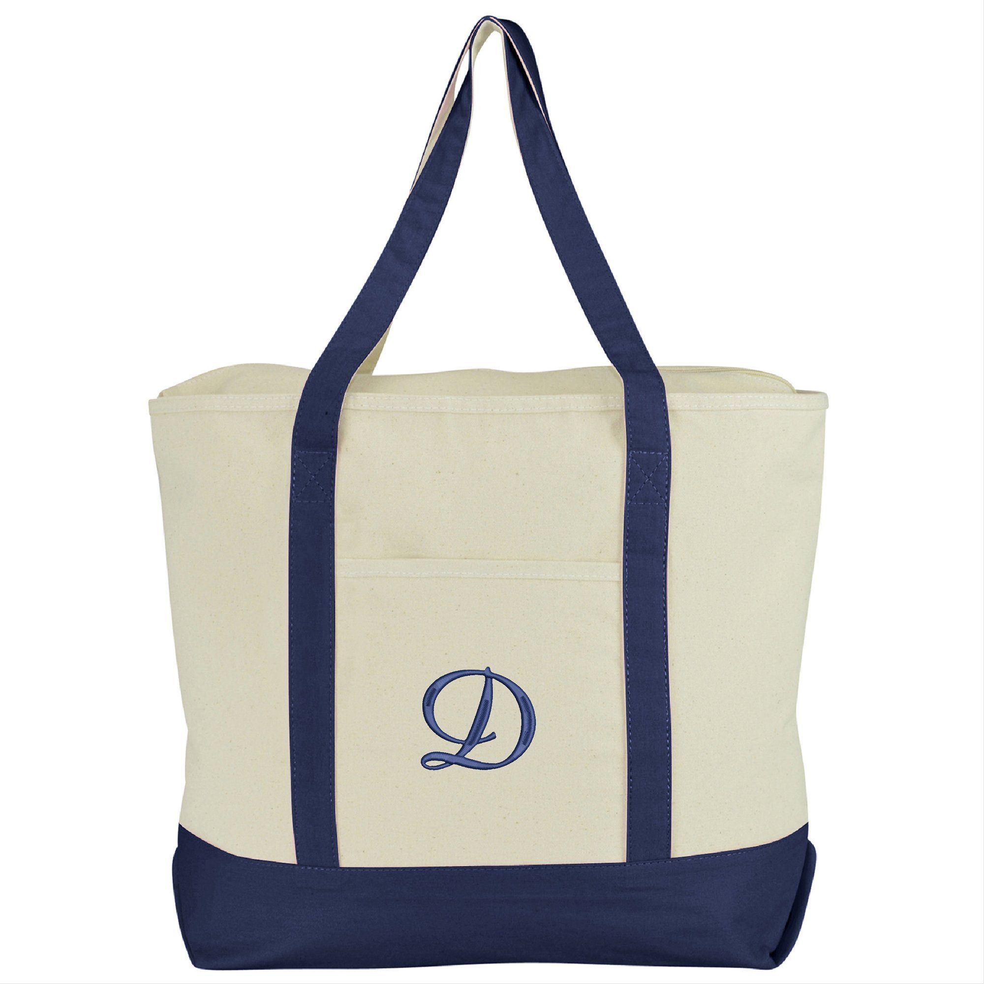 Our best selling DALIX tote now features beautiful premium embroidery: Custom designed, our tote features a beautiful monogram alphabet letter of your choice! Sewn with premium threading, we ensure an ever-lasting design embroidery on our products. This tote features a heavy duty cotton canvas material with a Zipper opening to keep your goods safe. There is also a front pocket for accessories storage, and comes in more wonderful colors! FEATURES: Heavy Duty Shopping Tote with Large top zipper w/ front open pocket. SIZE: 22" X 16" X 6". MATERIAL: 12 oz. Cotton Canvas. CLOSURE: Zipper, DROP STRAP LENGTH: 9" . COLORS: Navy Blue. LETTER DESIGN: A , B , C , D , E , F , G , H , I , J , K , L , M , N , O , P , Q , R , S , T , U , V , W , X , Y , Z .