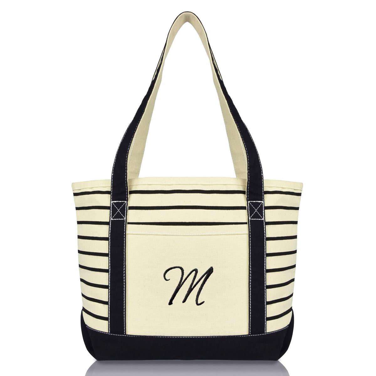 Express yourselves with our Initial Letter 100% premium cotton striped tote bag in a great style that lasts over time. Stitched with the best quality threading, our designs are carefully thought through to give the best vibrance and feel. Use this french sailor patterned bag on sailing trips, beach outings or just everyday wear. Great as a gift for a birthday, special occasion mom, grandmother or daughter. Both economical and eco-friendly, all bags feature a Large Outer Pocket, Zippered Inner Pocket, and Zippered Top Closure. Initial Letter: M / Size: Small, Medium, Large / Color: Black, Navy Blue, Red