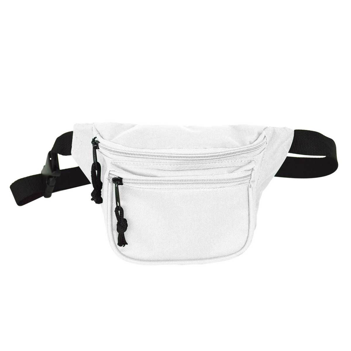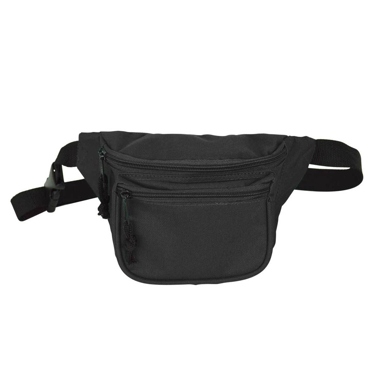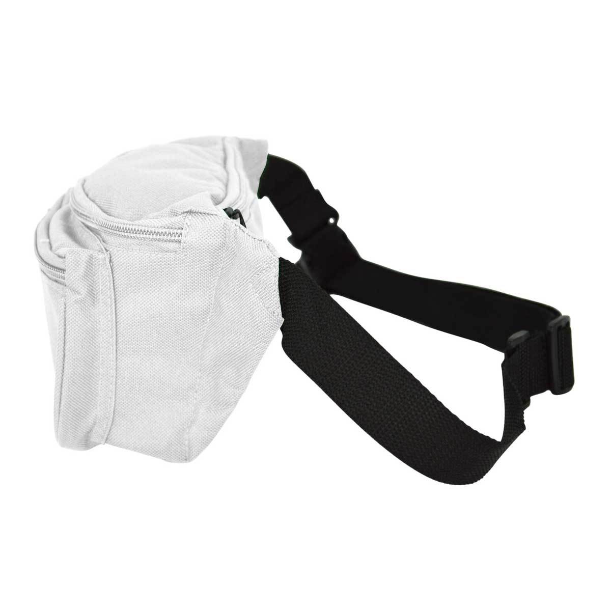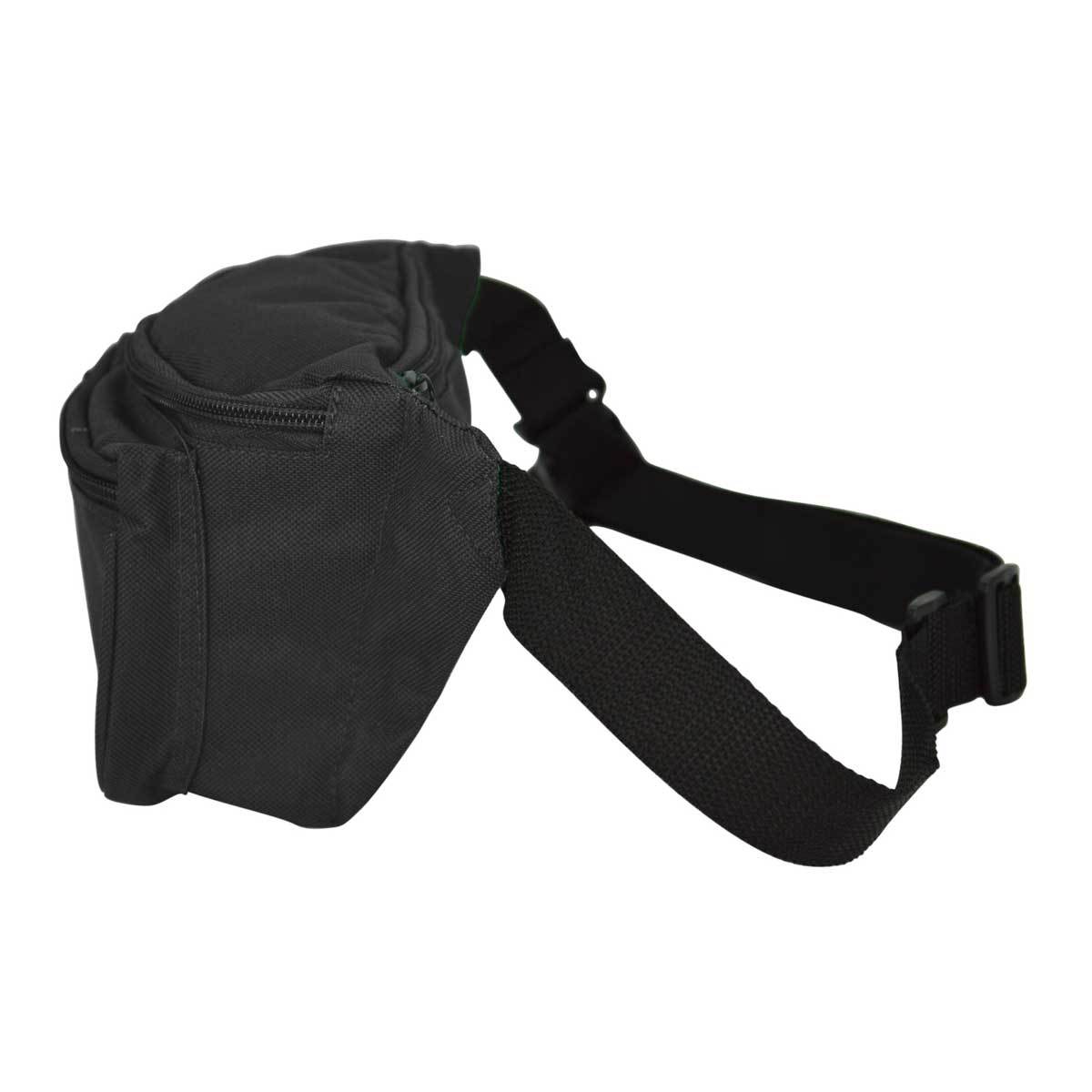 Dalix lightweight Fanny Pack has 3 Pockets total; 2 small compartments in the front and 1 Main Compartment in the rear. Has an adjustable belt strap which Snaps around the waist easily with a buckle for easy removal and transfer