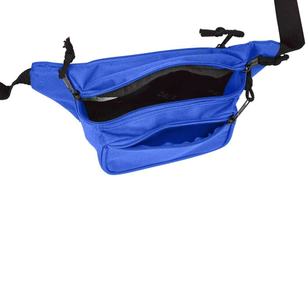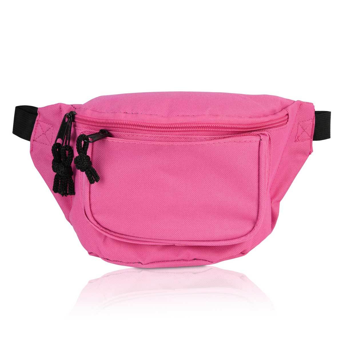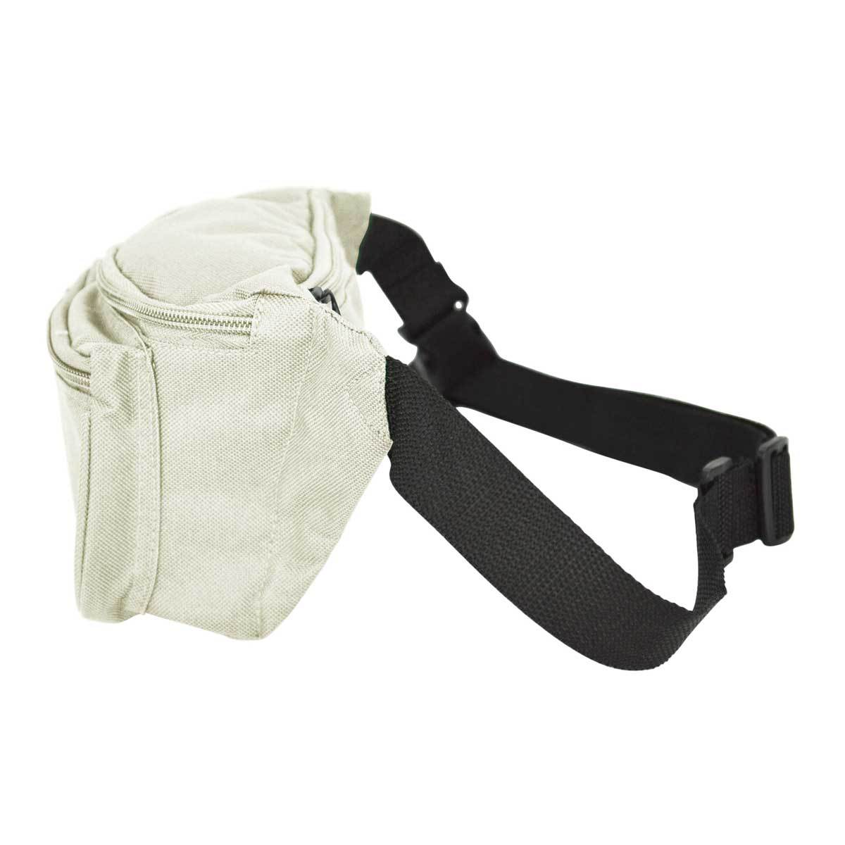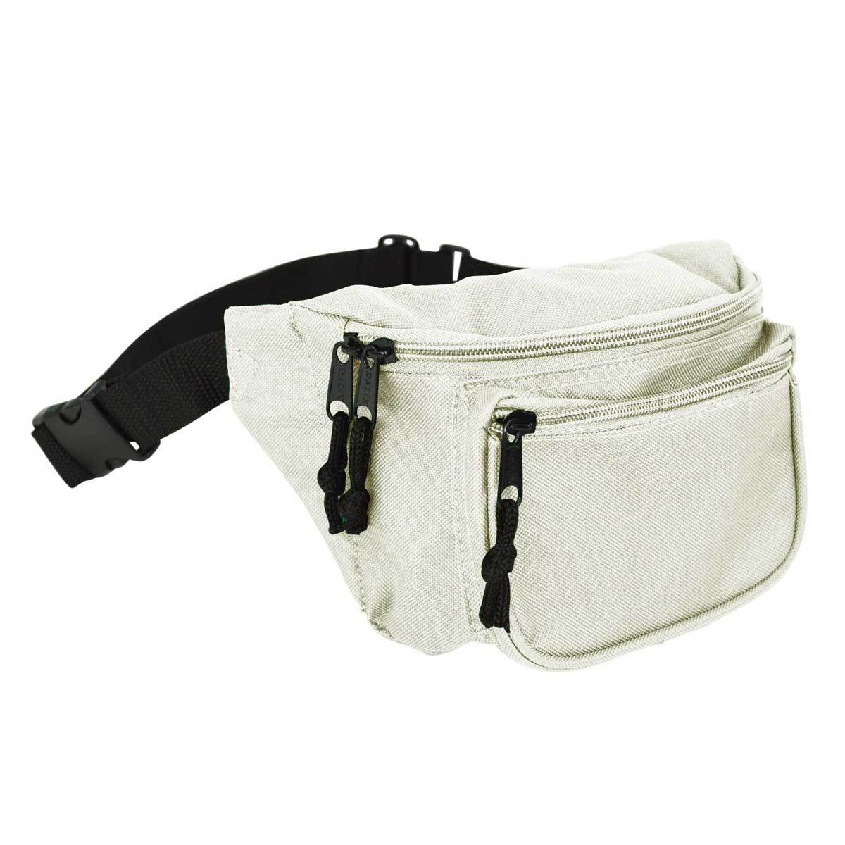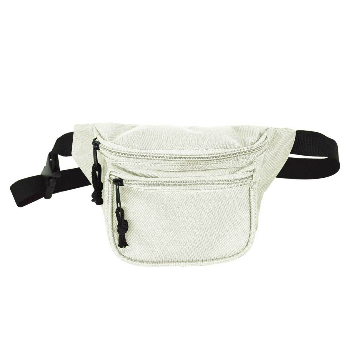 Dalix lightweight Fanny Pack has 3 Pockets total; 2 small compartments in the front and 1 Main Compartment in the rear. Has an adjustable belt strap which Snaps around the waist easily with a buckle for easy removal and transfer