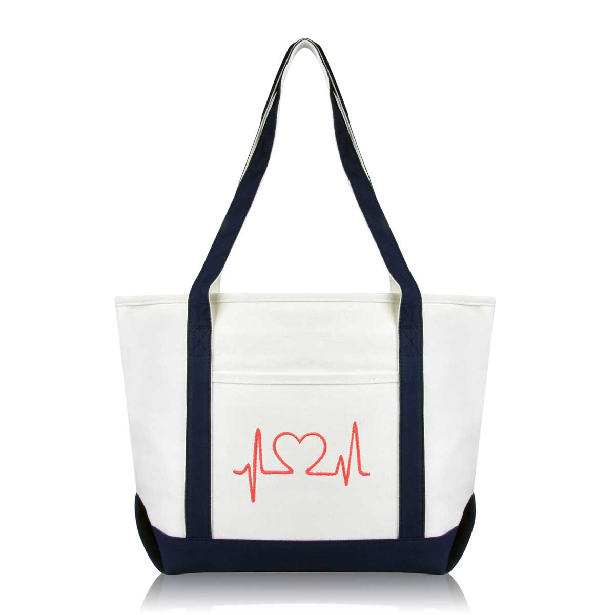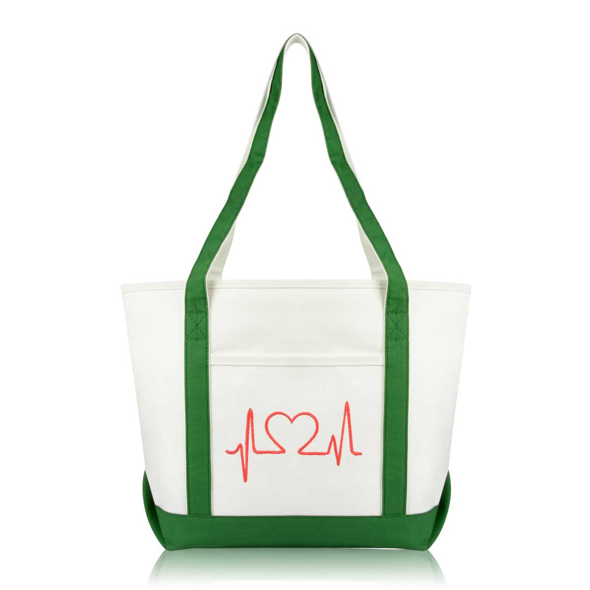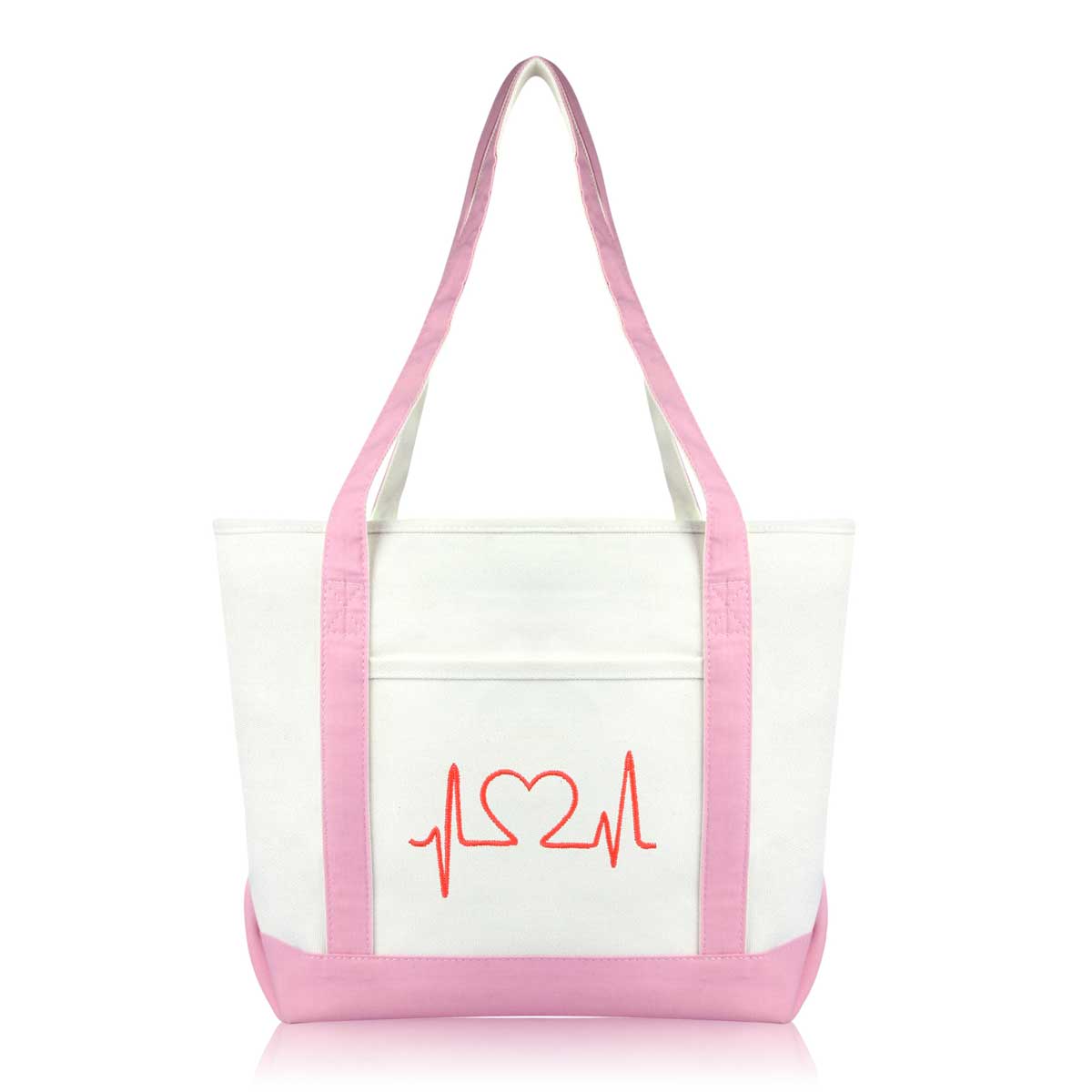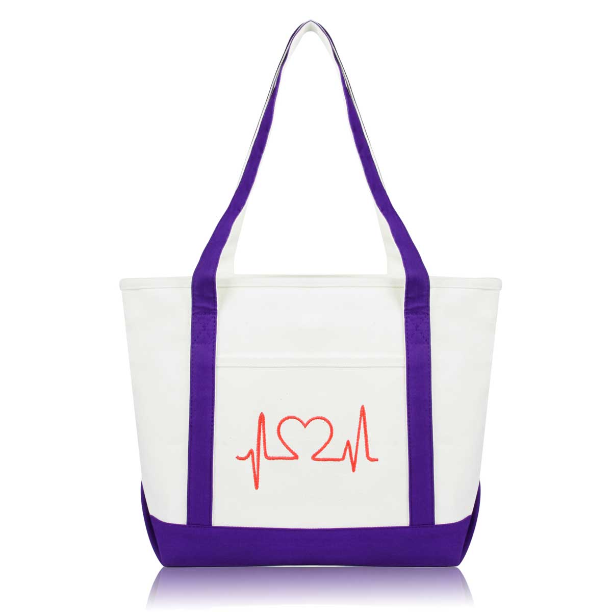 This shoulder tote bag is essential as a daily bag, and a must have! For all our lovely health care professionals, RN, and Nurses Assistants who travel to and from home, this is the perfect bag for carrying all your necessities. Featured on this canvas tote is an embroidered Heartbeat / EKG Life Line; symbolizing endurance, life, love, power, passion, persistence, strength, and the ability to keep going forward regardless the troubles ahead or behind. Each heart beat is a blessing, as this sends a reminder that life is precious and we are stronger one experience at a time. Our bag includes plenty of storage space; the roomy front pocket is more than enough to fit grab-and-go necessities such as phones, ID cards, pens, and notepads. The second pocket is a convenient zippered pouch attached in the main compartment for important items such as wallets and cash, or smaller items like scissors, band aids, and thermometers. The main compartment is generous on space to fit your medical dictionary, stethoscope, lotions/hand sanitizers, OTC medications, and lunches. Not to mention, it accommodates well with a lobster clasp cord on the inner lining to easily attach and detach your keys. This is great as a daily shoulder bag; take it to out a day out, to work, or class. It can also be a wonderful gift to a friend in the medical industry for birthdays or Valentine's Day. Comes in Black, Brown, Dark Green, Gold, Gray, Navy Blue, Pink, Purple, Red, Royal Blue, and White