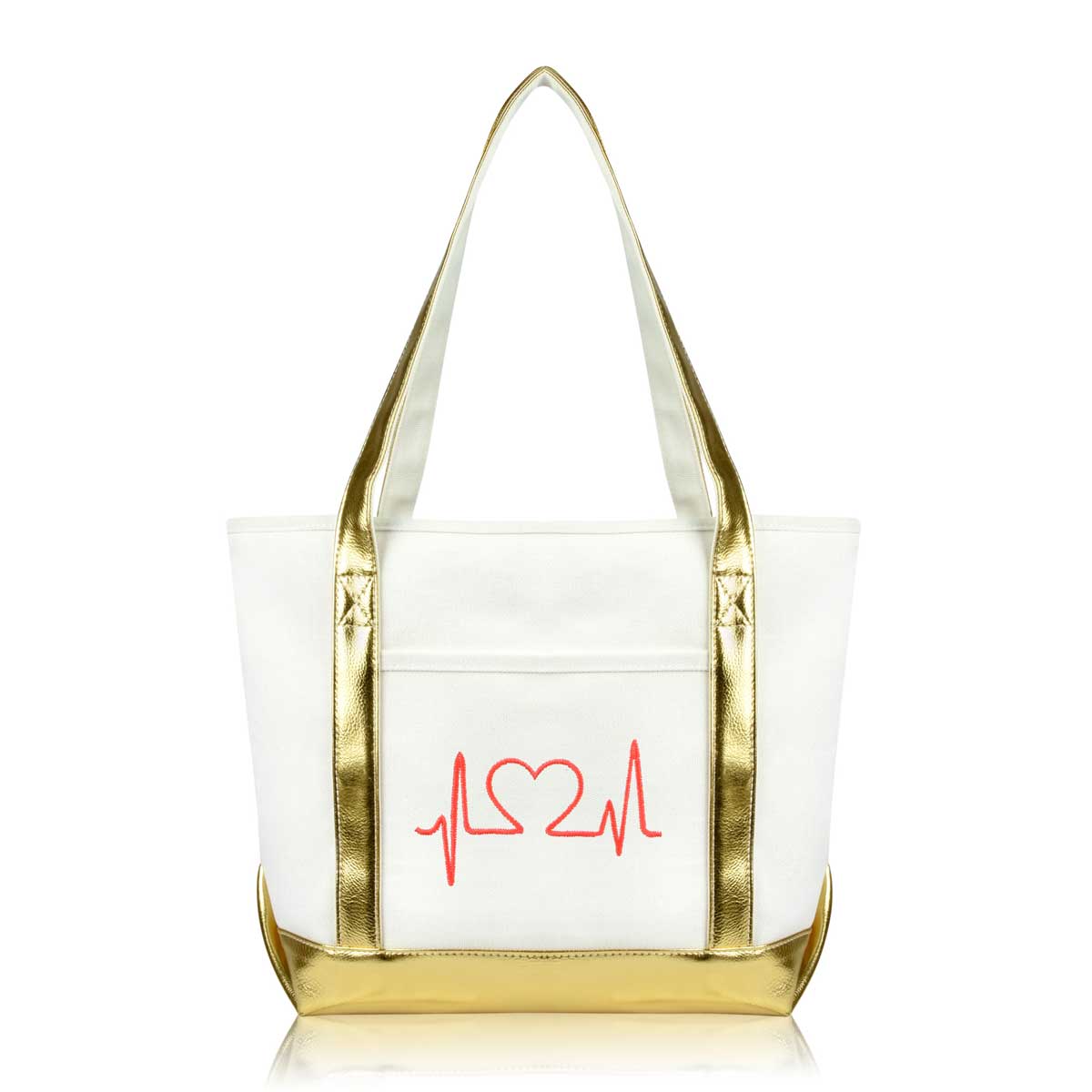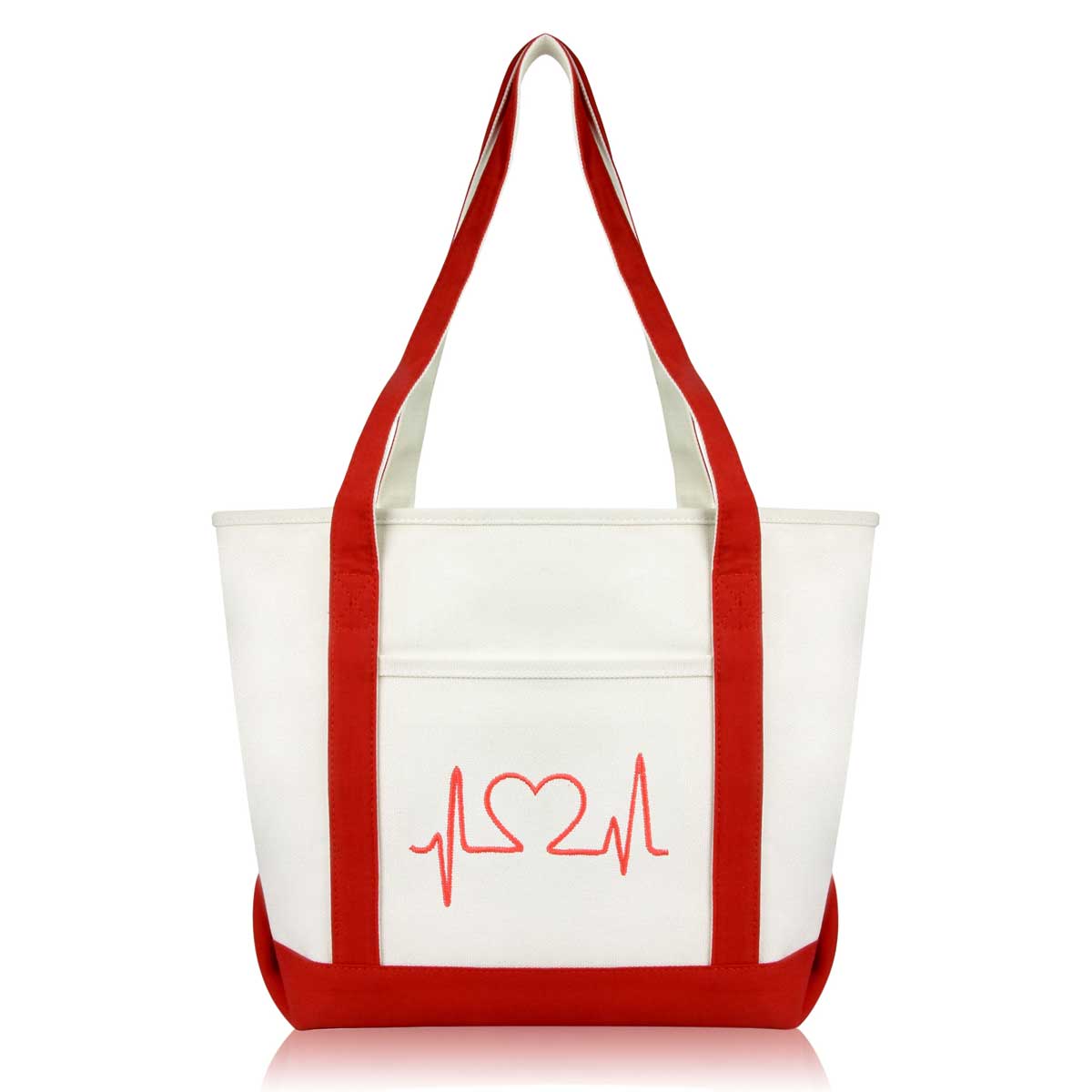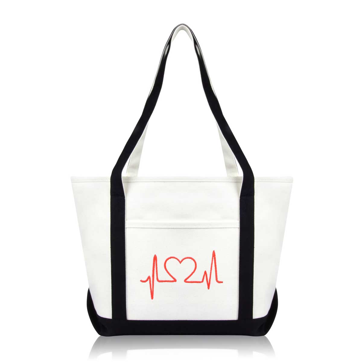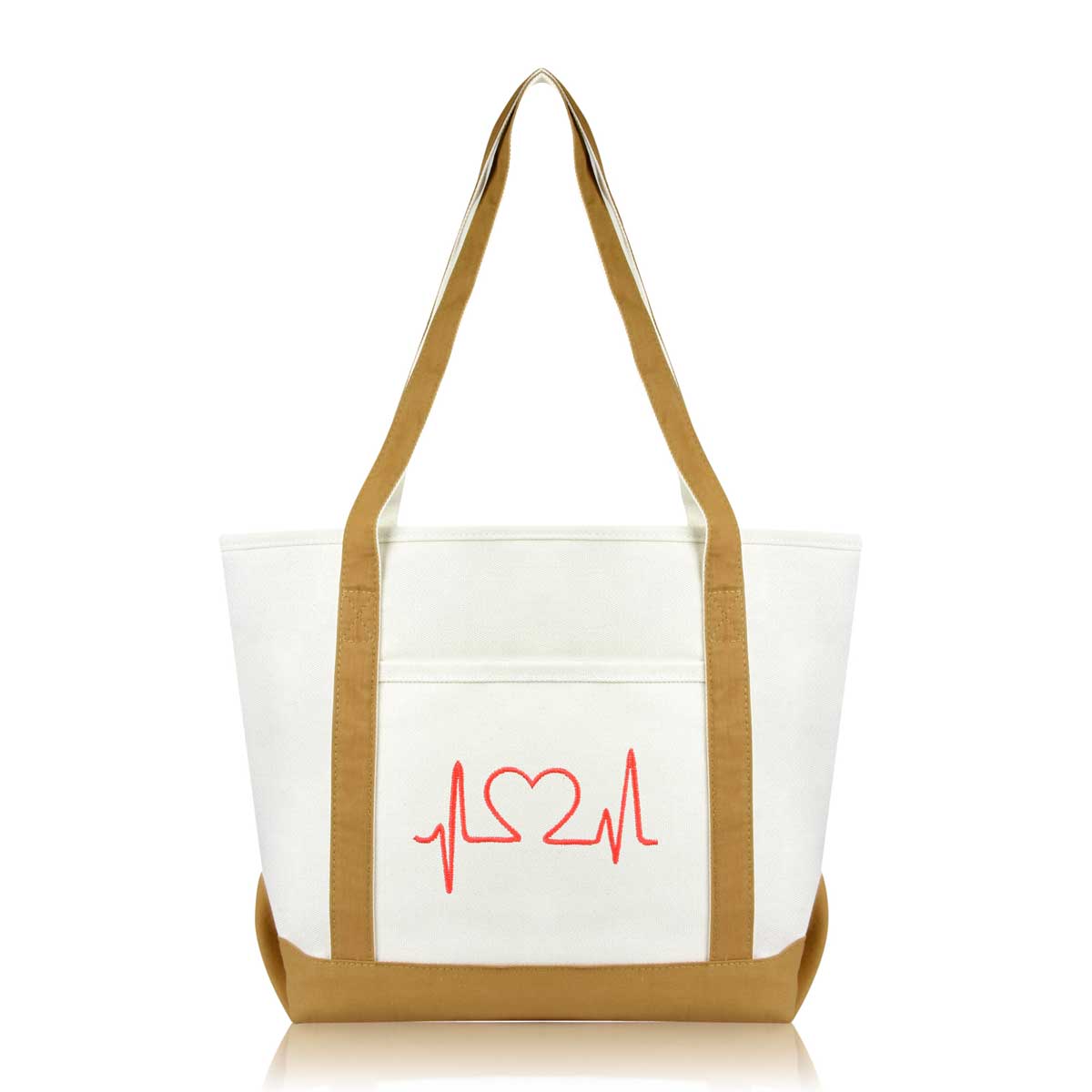 This shoulder tote bag is essential as a daily bag, and a must have! For all our lovely health care professionals, RN, and Nurses Assistants who travel to and from home, this is the perfect bag for carrying all your necessities. Featured on this canvas tote is an embroidered Heartbeat / EKG Life Line; symbolizing endurance, life, love, power, passion, persistence, strength, and the ability to keep going forward regardless the troubles ahead or behind. Each heart beat is a blessing, as this sends a reminder that life is precious and we are stronger one experience at a time. Our bag includes plenty of storage space; the roomy front pocket is more than enough to fit grab-and-go necessities such as phones, ID cards, pens, and notepads. The second pocket is a convenient zippered pouch attached in the main compartment for important items such as wallets and cash, or smaller items like scissors, band aids, and thermometers. The main compartment is generous on space to fit your medical dictionary, stethoscope, lotions/hand sanitizers, OTC medications, and lunches. Not to mention, it accommodates well with a lobster clasp cord on the inner lining to easily attach and detach your keys. This is great as a daily shoulder bag; take it to out a day out, to work, or class. It can also be a wonderful gift to a friend in the medical industry for birthdays or Valentine's Day. Comes in Black, Brown, Dark Green, Gold, Gray, Navy Blue, Pink, Purple, Red, Royal Blue, and White