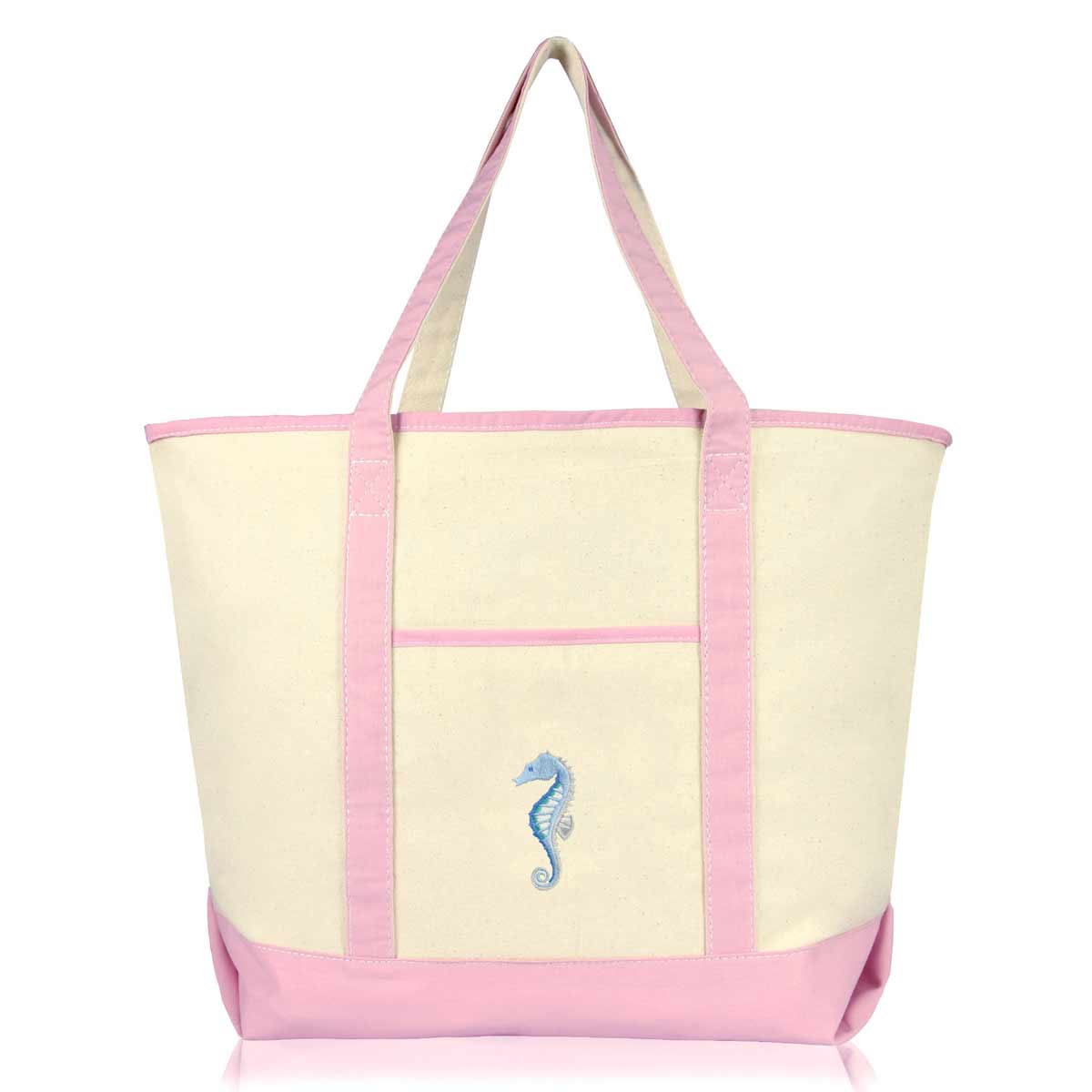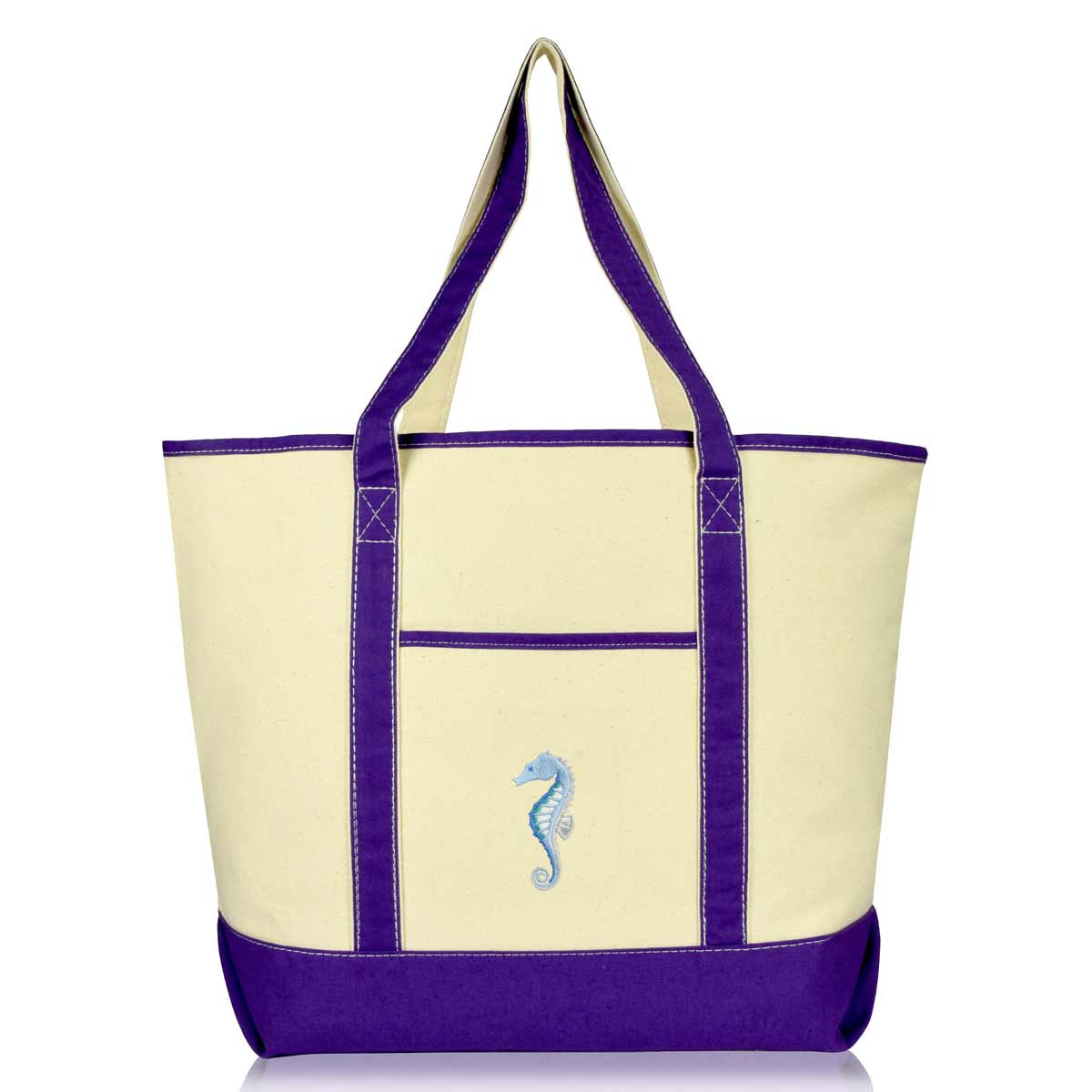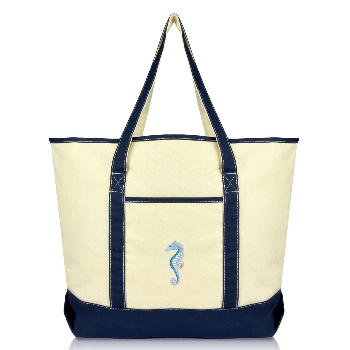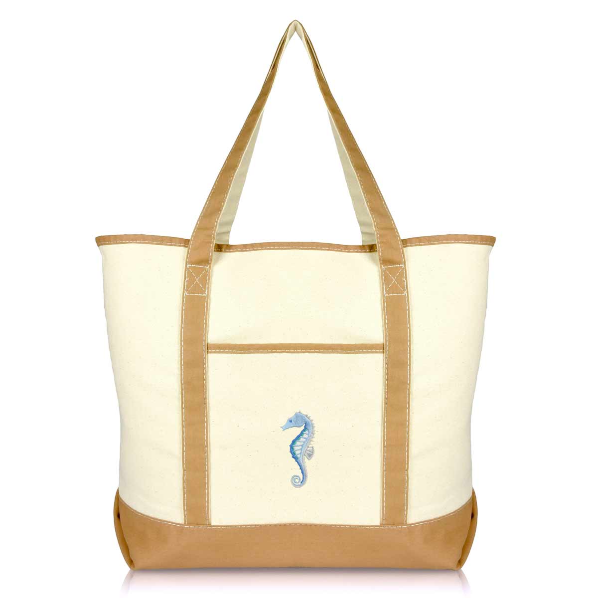 The Seahorse, actually a type of fish. They live in water, breathe through gills and have a swim bladder. Their caudal fins create a long shape like a snake's tail. Most notably, their neck and snout pointing down is similar to a shape of a horse. The Latin name, Hippocampus, which means Horse Caterpillar, helps keep clean our oceans of its plankton and tiny fish. Our design represents this ocean wildlife featuring detailed embroidery stitching beautifully decorated to complement your outfit. Made with 100% premium cotton canvas, light weight, soft to the touch, and durable for heavier loads. This tote features a heavy duty 12 oz. cotton canvas with open top for easy storage access and includes a zipper pocket for accessories when you travel to ensure your important belongings don't fall out. There is also a front pocket for accessories storage, and comes in more wonderful colors! For those on a budget but still wanting a quality product.